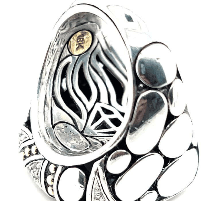 John Hardy jewelry is celebrated for its handcrafted techniques and distinctive use of mixed metals. By combining sterling silver with 18 karat yellow gold accents, the designs create visual contrast while highlighting intricate textures and detailing. This approach reflects the brand’s commitment to artisanal craftsmanship and timeless yet bold styling, making mixed-metal John Hardy pieces especially sought after in estate and designer jewelry collections.