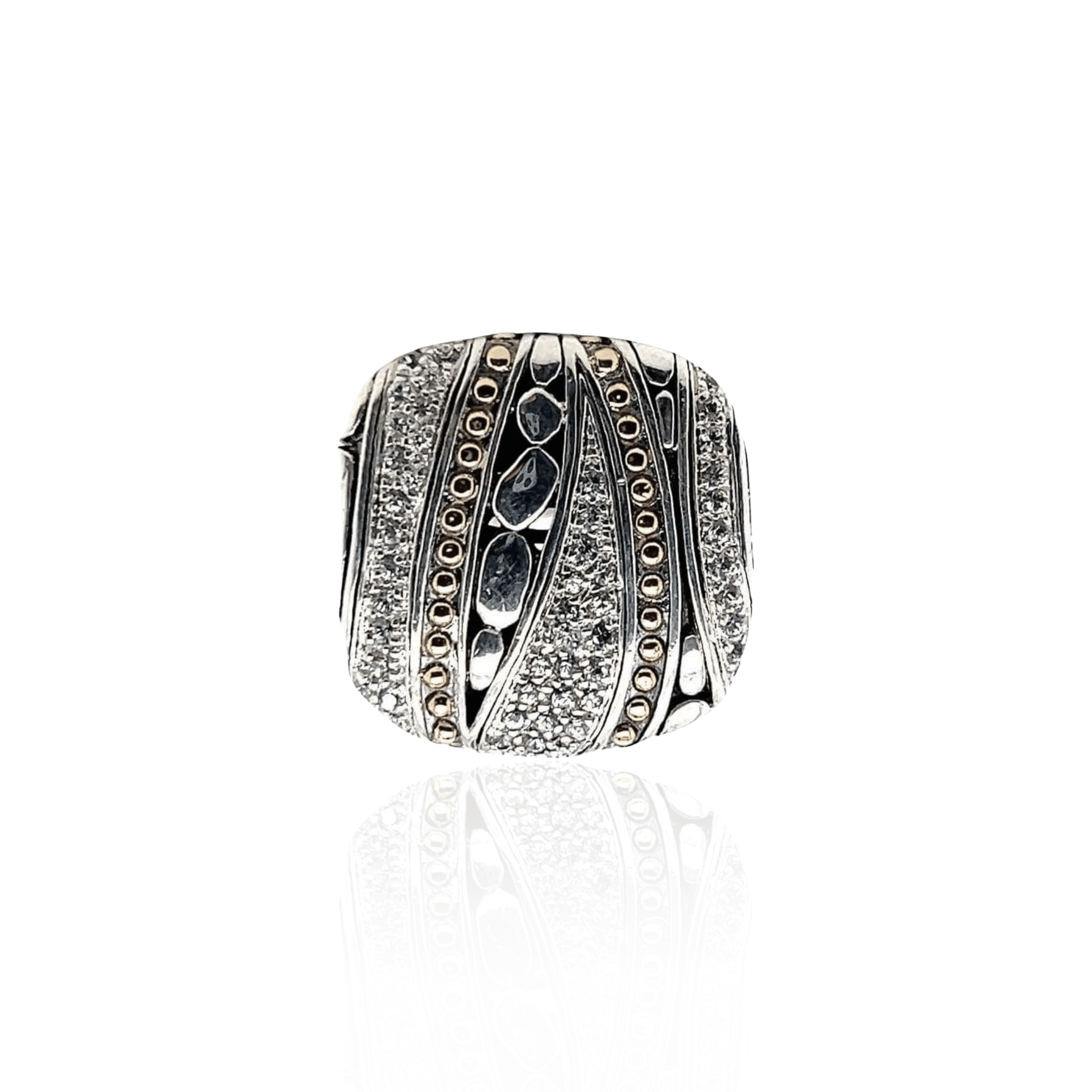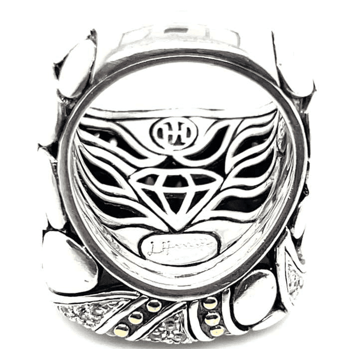 This estate John Hardy ring is crafted in sterling silver with rich 18 karat yellow gold accents and features a striking mix of round brilliant diamonds and colorless corundum. The wide, sculptural band showcases layered textures, pavé-set sparkle, and signature gold dot detailing that creates depth and contrast across the surface. Measuring approximately 7/8 inch in both length and width, the ring delivers a bold presence while maintaining the refined craftsmanship John Hardy is known for.