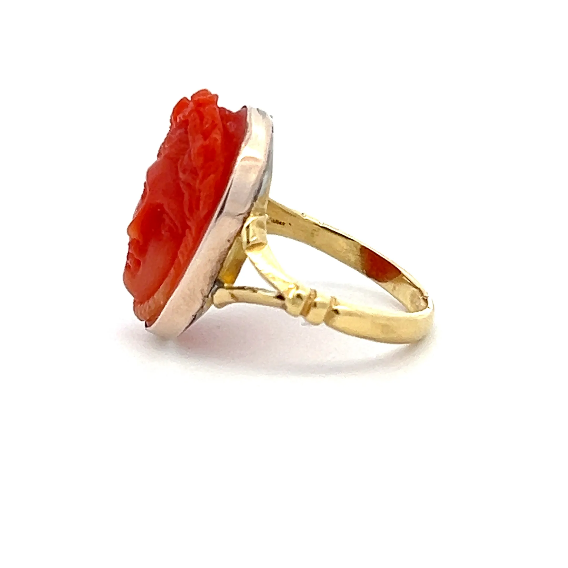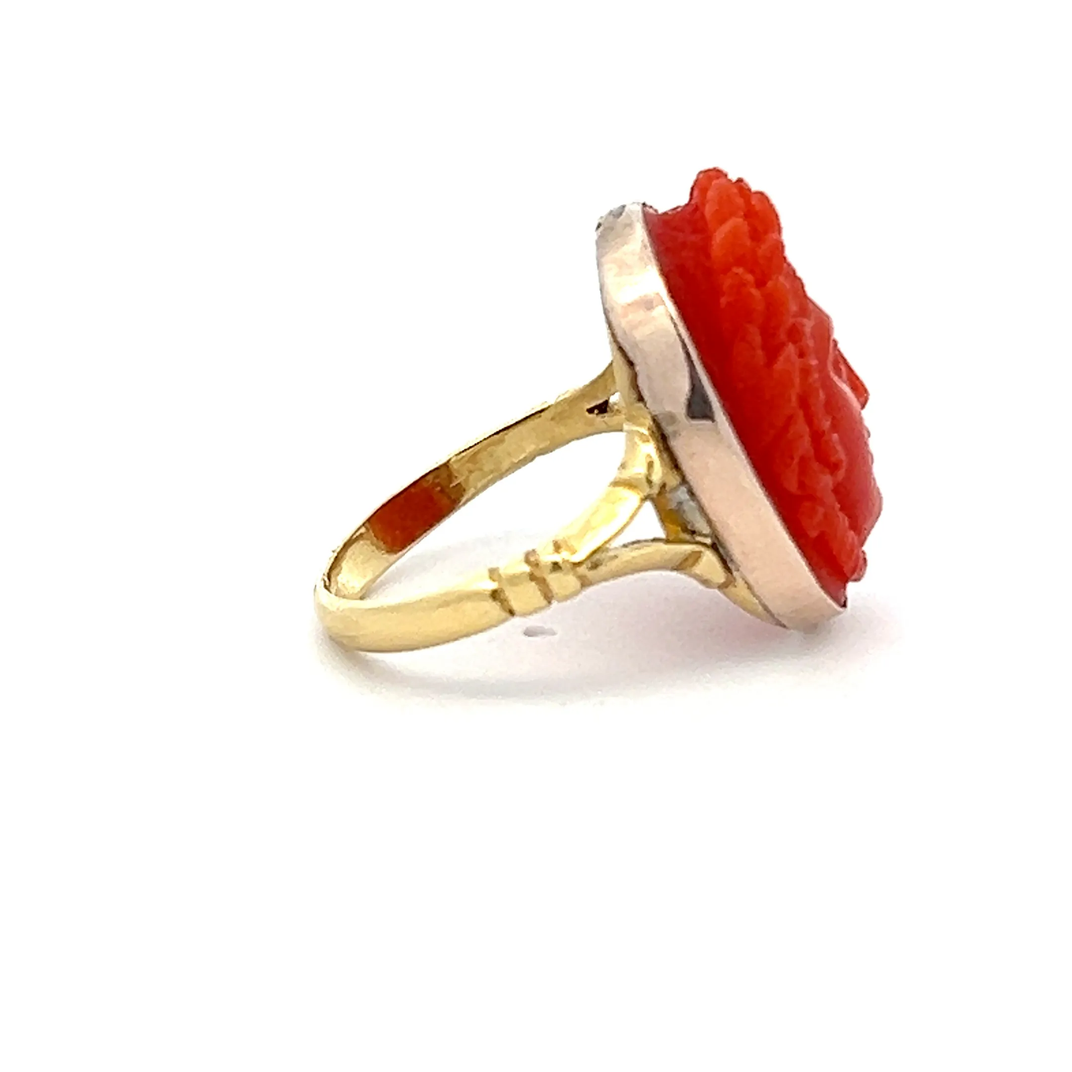 This estate Victorian-era ring features a striking 15 x 20mm hand-carved coral cameo set in a gold filled bezel atop an 18K yellow gold shank. The rich orange-red coral has been sculpted into the serene face of a classical figure, framed by softly tapering shoulders and delicate metalwork.