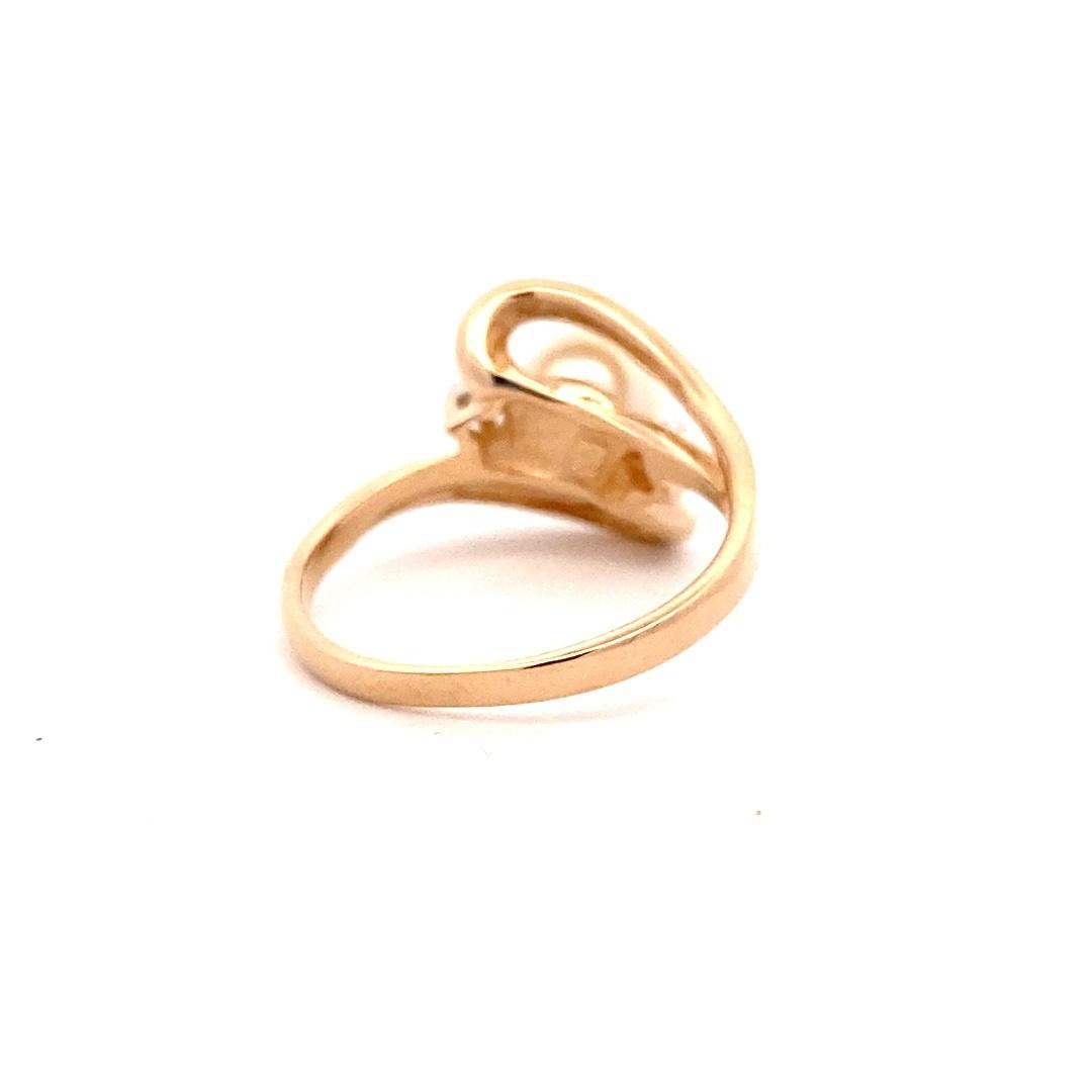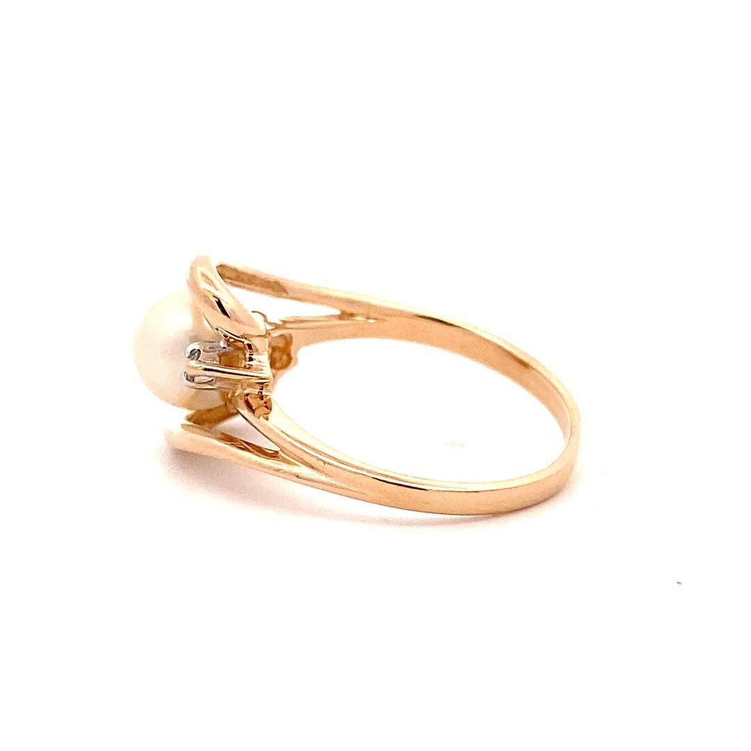 The Estate Pearl and Diamond Bypass Ring is crafted from 14 karat yellow gold and features a round freshwater cultured pearl with a hint of champagne color measuring 6.83mm accented by 2 round brilliant-cut diamonds in an open-style bypass design.