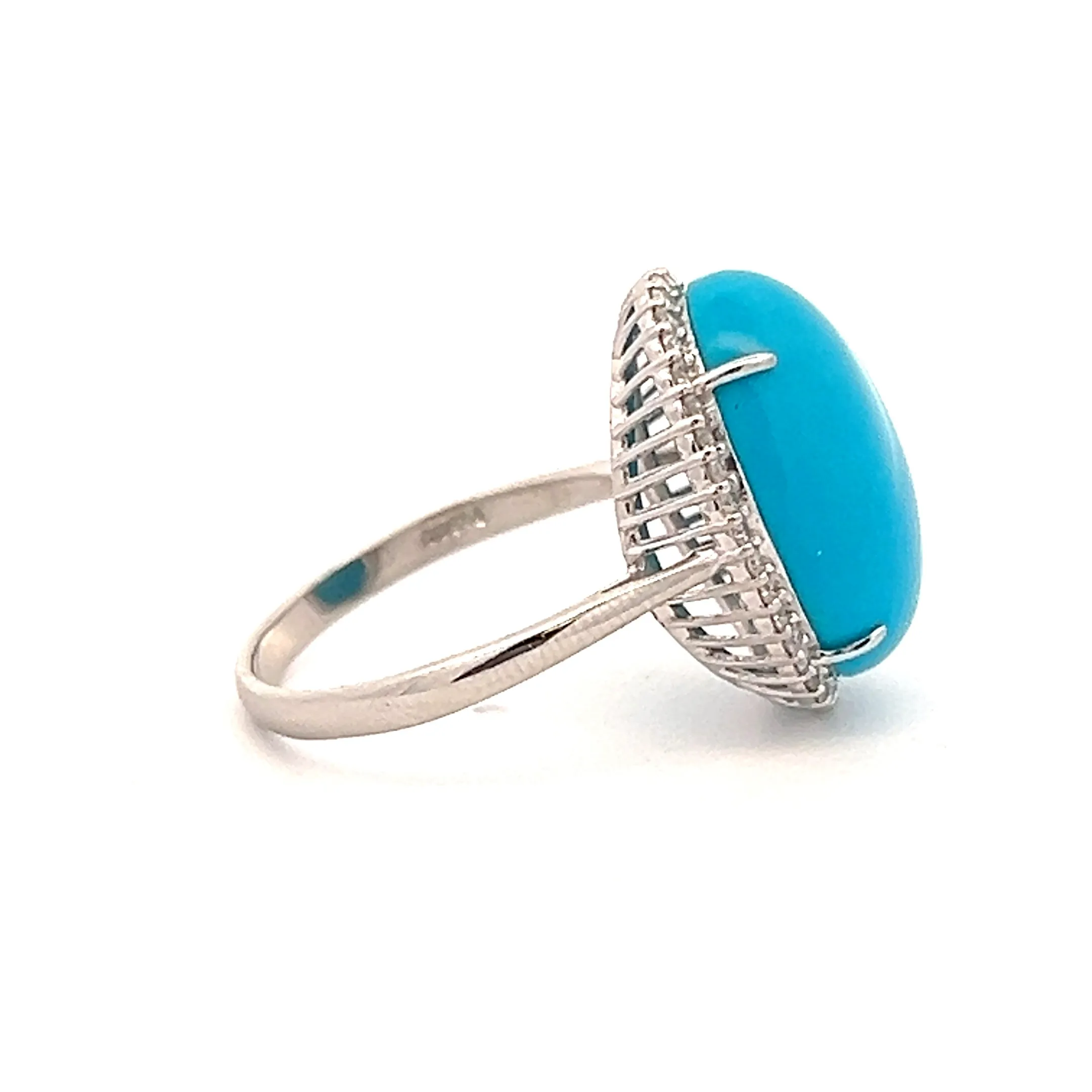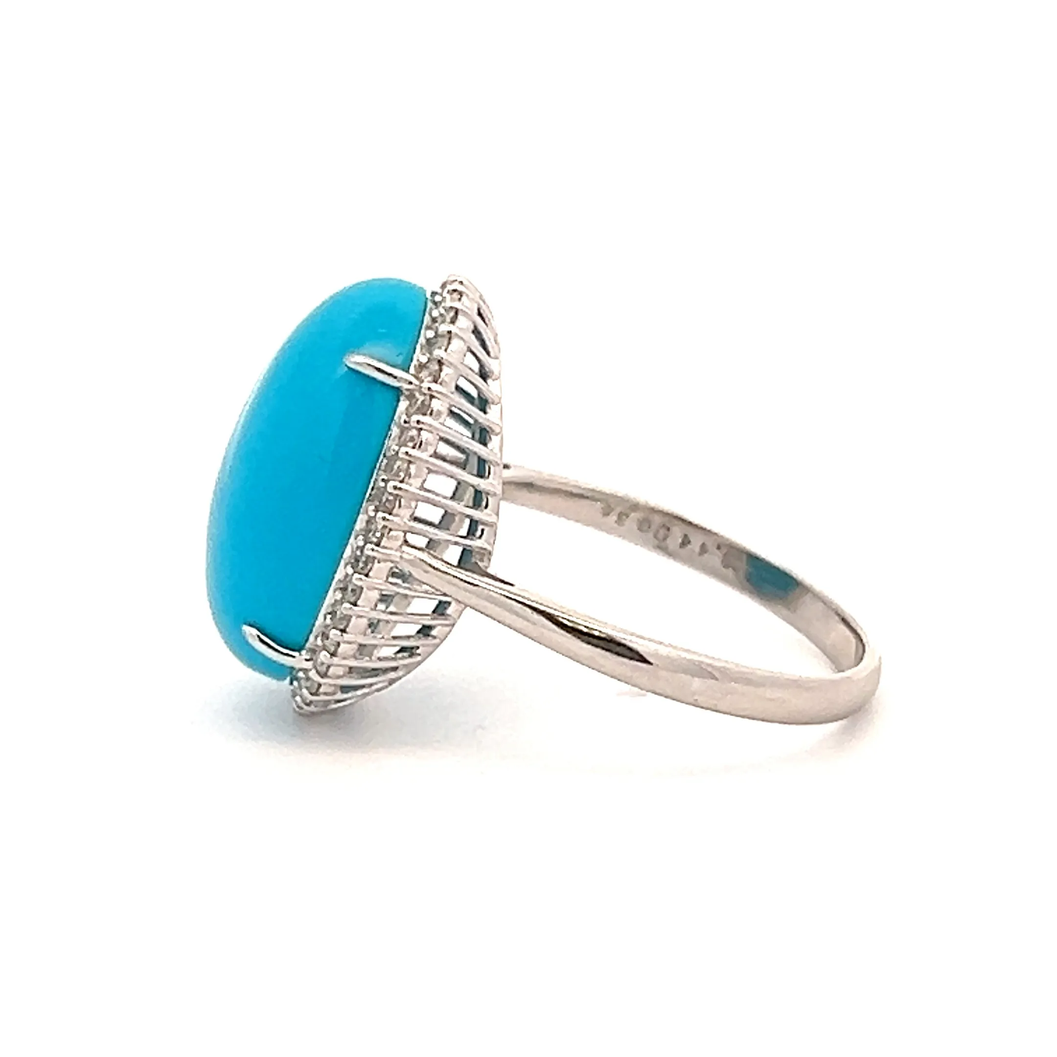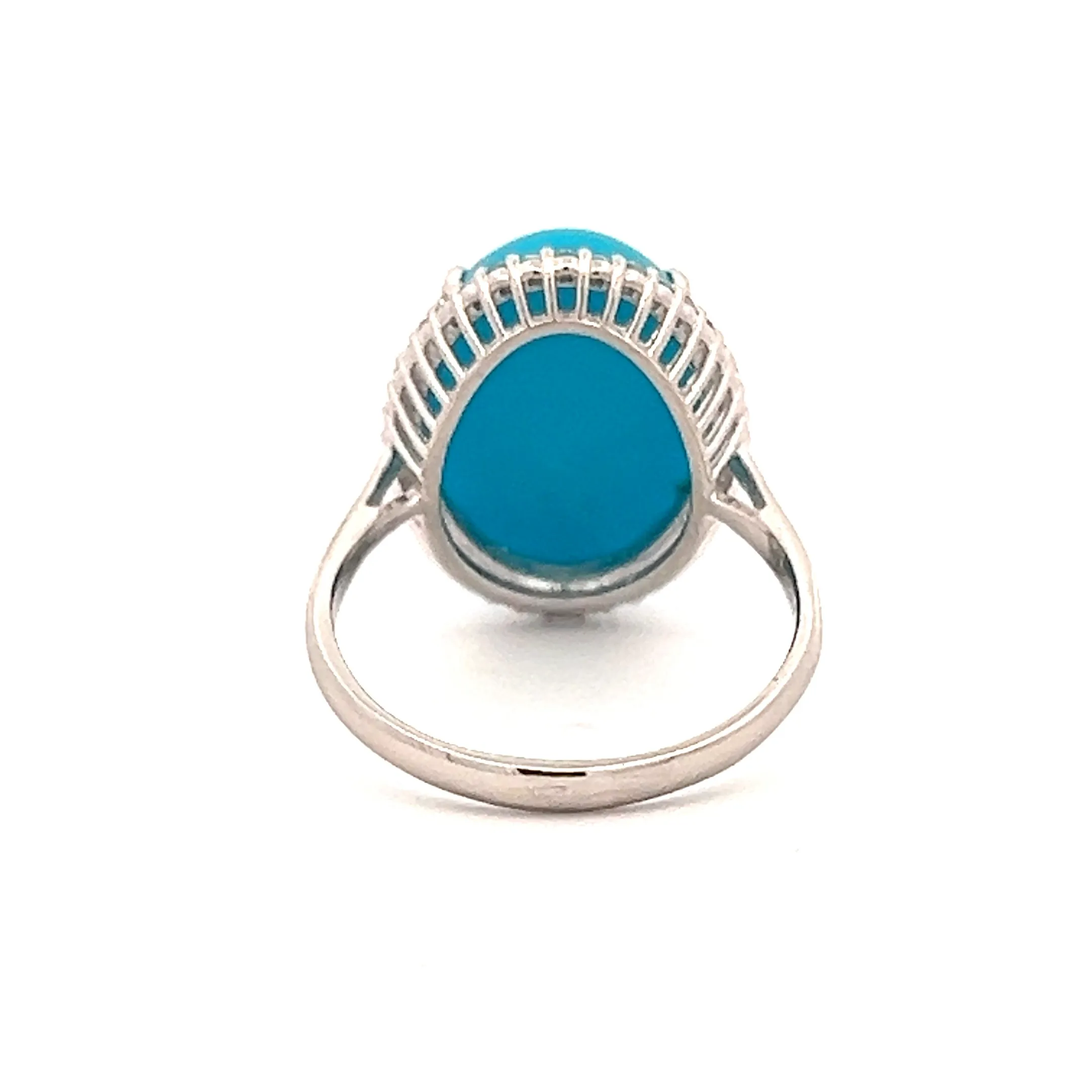 Set in cool-toned platinum, this estate ring showcases a vivid 17.91 x 13.1 mm turquoise cabochon, encircled by a halo of 38 round brilliant diamonds. The turquoise’s saturated hue is perfectly balanced by the surrounding diamonds’ subtle sparkle, bringing brightness and contrast to the generously sized stone. The low-profile halo setting and slim 2 mm shank create a streamlined, wearable silhouette that still delivers bold color impact.