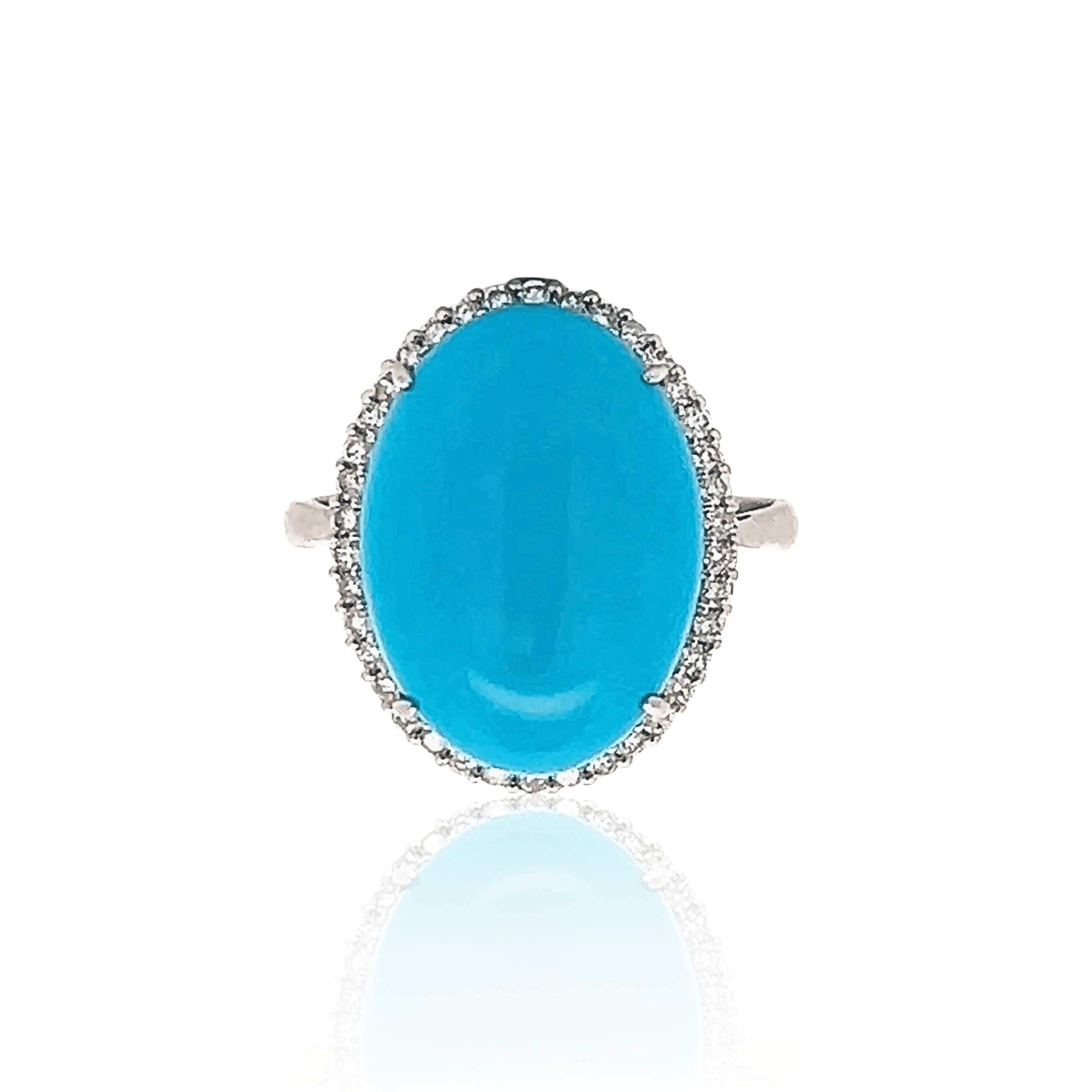 This ring is an ideal choice for lovers of clean geometry and vibrant color. The sleek design brings out the turquoise’s natural brilliance, while the diamond halo adds a hint of formality. It’s striking enough to wear solo, but pairs beautifully with other white-metal bands and stacking rings for a layered look that feels both collected and intentional.