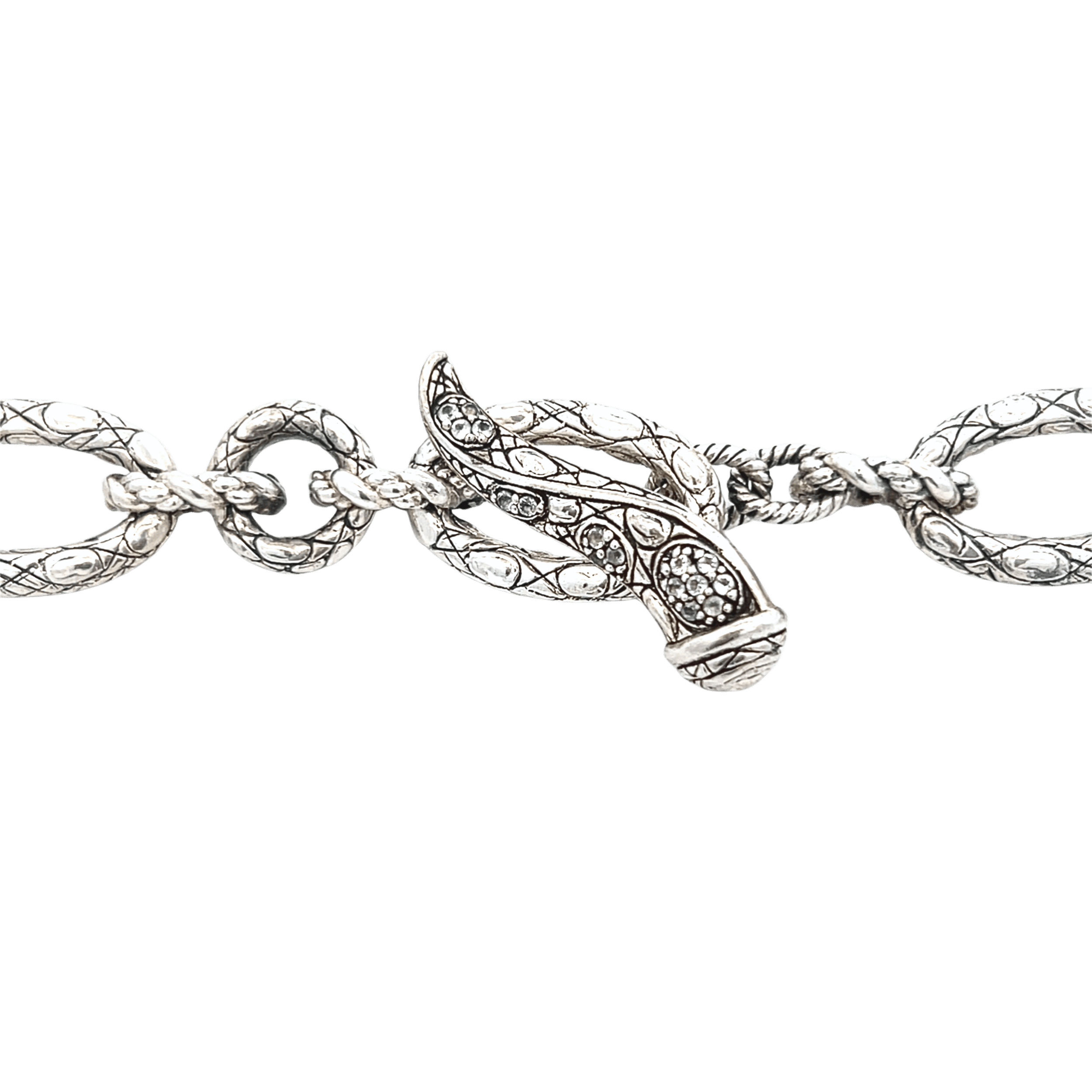 This estate John Hardy necklace is crafted in sterling silver and features the distinctive Jai snake skin link design, known for its intricate texture and fluid movement. The links are substantial yet flexible, creating a necklace that drapes with intention rather than stiffness. White topaz accents are set into the sculptural toggle clasp, adding subtle sparkle while keeping the focus on the silver craftsmanship and bold construction.