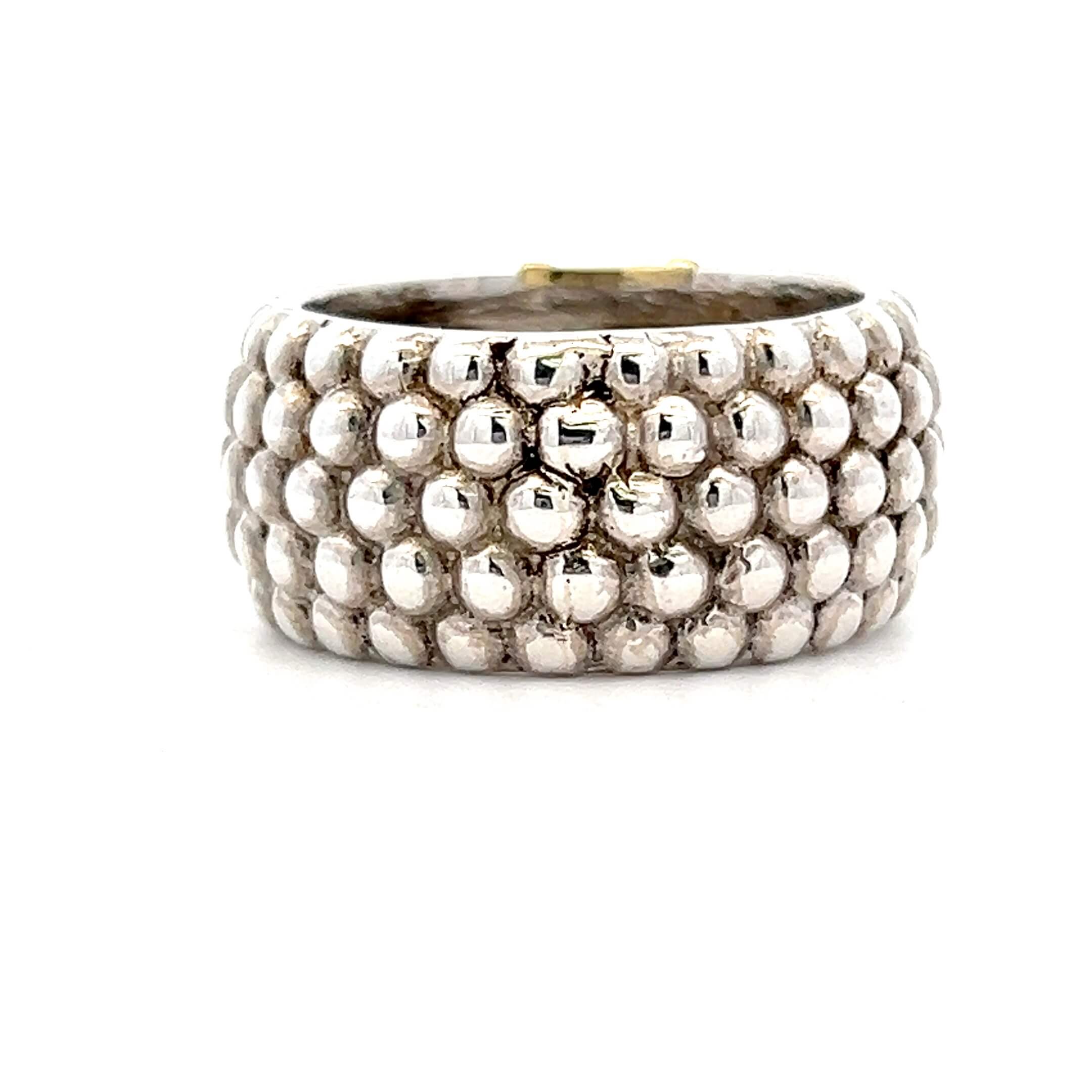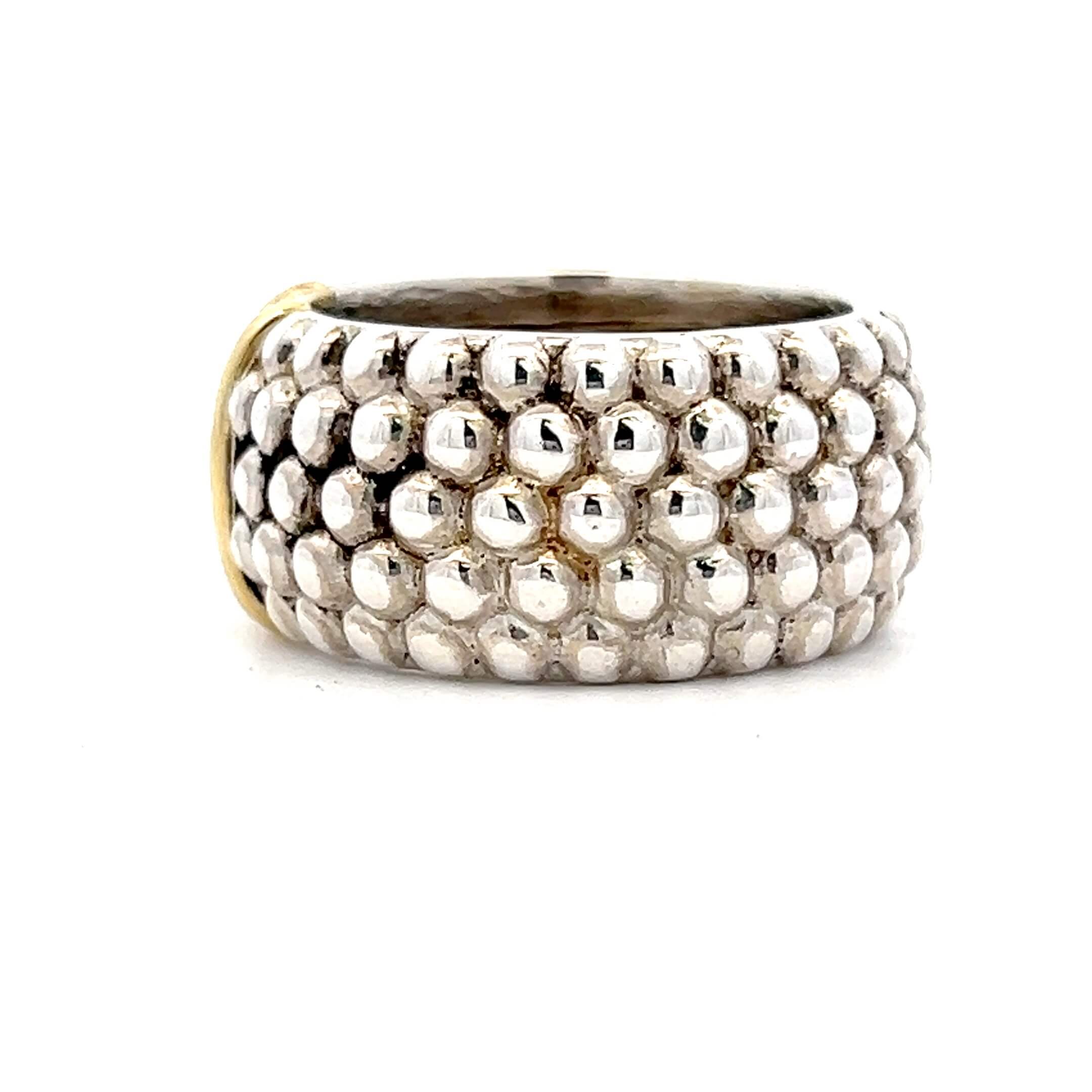 One (1) estate sterling silver and 18 karat yellow gold Lagos Caviar ring set with seventeen (17) round brilliant diamonds approximately 0.35 total carat weight with I color and SI2 clarity. The ring is a finger size 9.