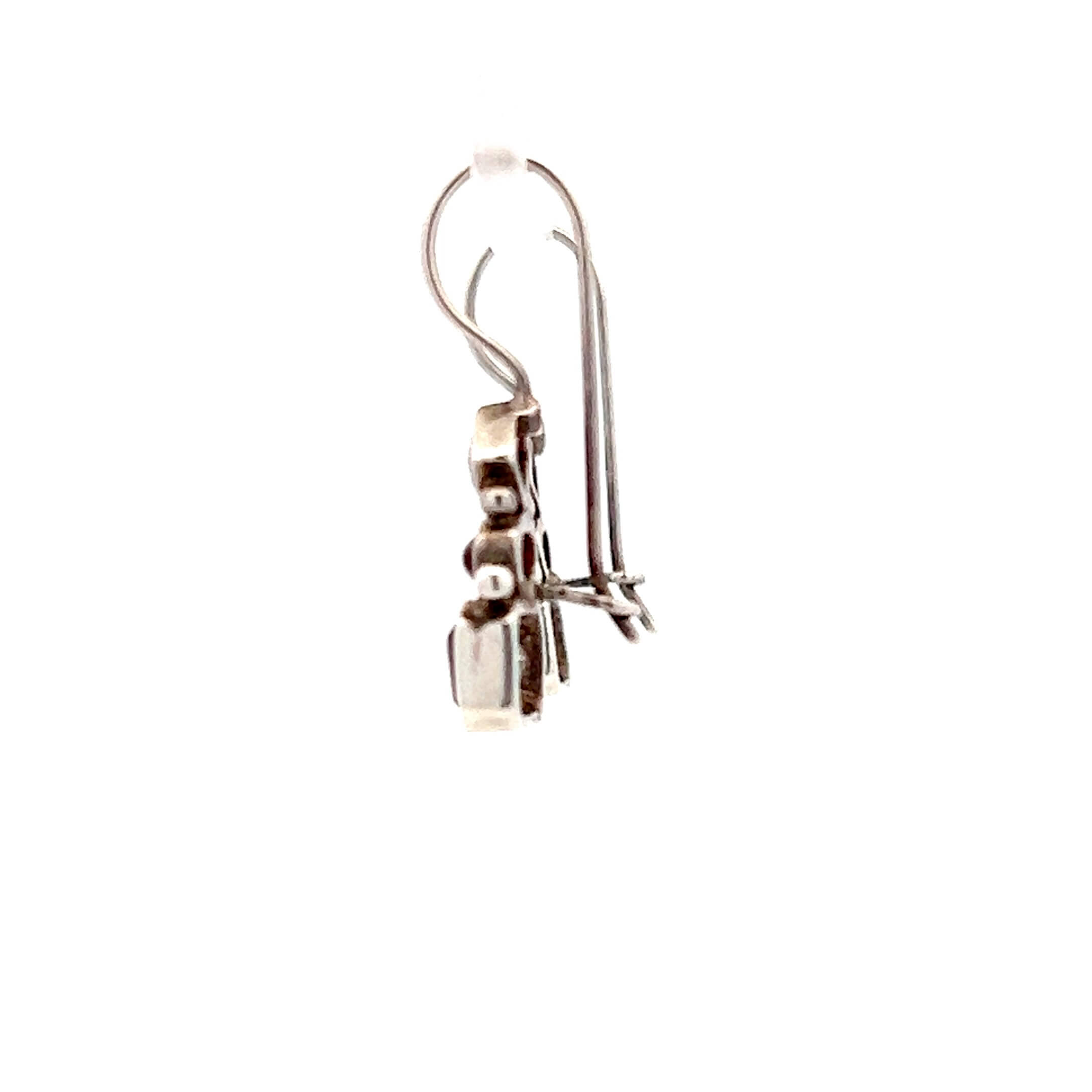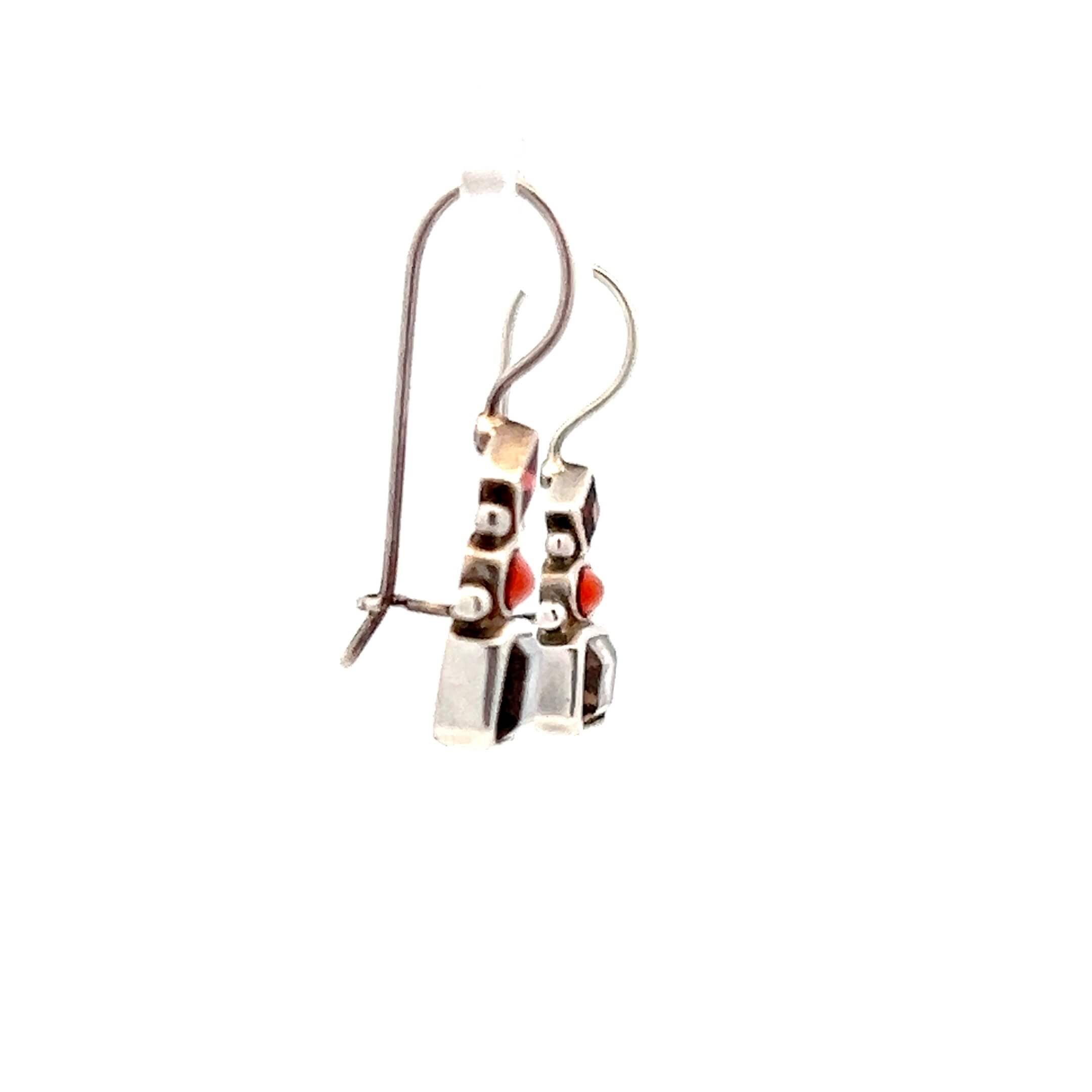 These estate drop earrings are crafted in sterling silver and feature a vertical arrangement of smoky quartz, amber, and garnet in a clean, geometric design. The warm tones of the amber and garnet contrast beautifully with the cool, earthy depth of the smoky quartz, creating a balanced composition that feels both artistic and wearable. Lightweight and finished with classic shepherd hook backings, the earrings offer easy movement and comfortable all-day wear.