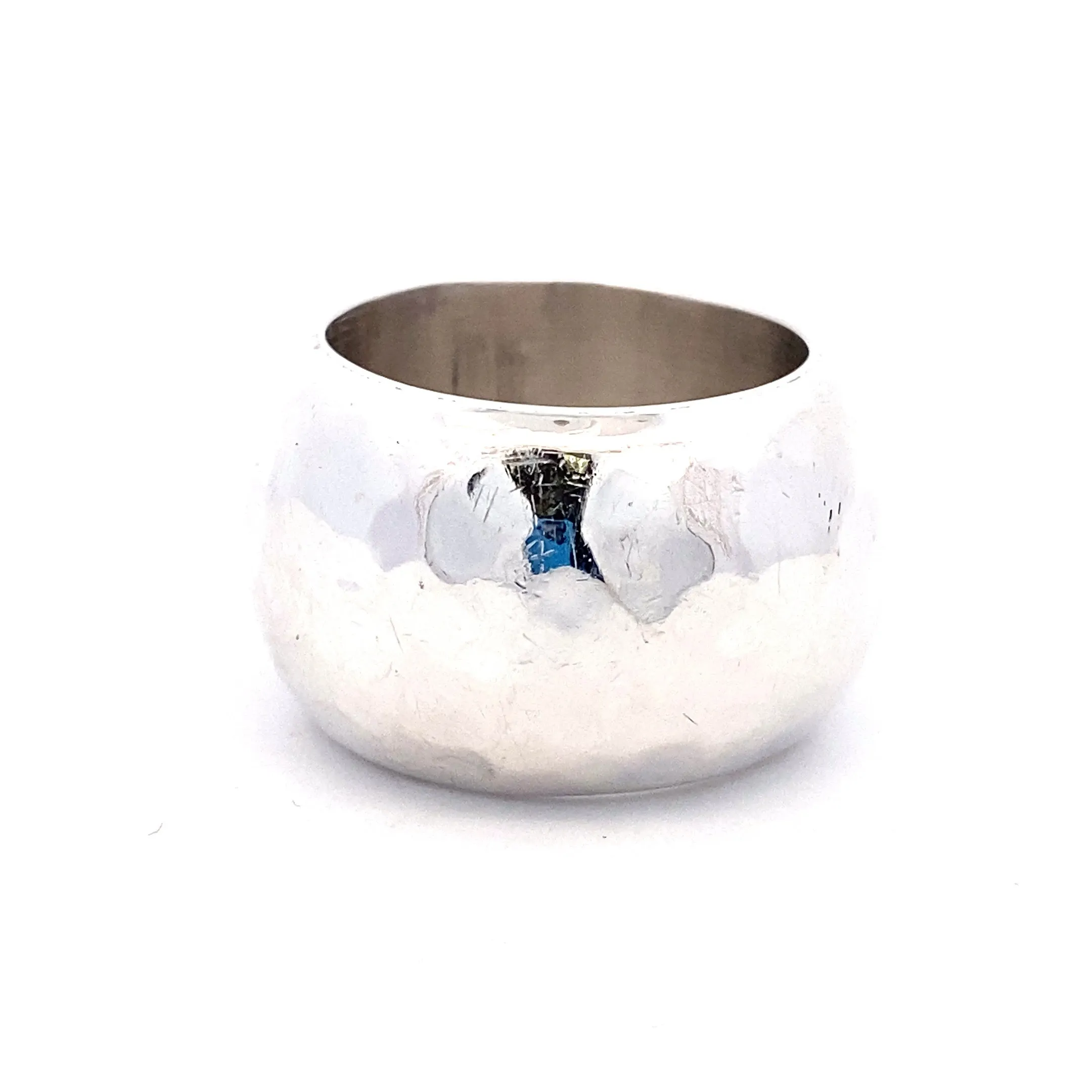 Bold in form and refined in texture, this estate ring features a wide domed band in sterling silver with a hand-hammered finish. Measuring 16mm across and 4.23mm thick, the substantial profile is softened by the organic surface texture and clean lines. Stamped 925 and Mexico, this piece reflects the modernist influence of Mexican silversmithing.