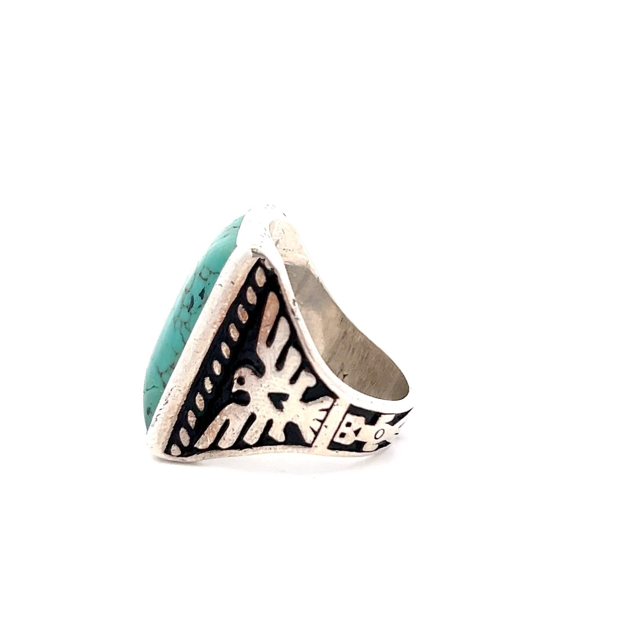 Striking and unapologetic, this ring is meant to be seen. The turquoise sits high and confident on the hand, while the detailed silverwork adds character and narrative from every angle. It works best as a standalone statement, paired with simple silver jewelry or worn on its own to let the craftsmanship and symbolism speak clearly. This is a piece that feels grounded, expressive, and full of history, not decorative for decoration’s sake.