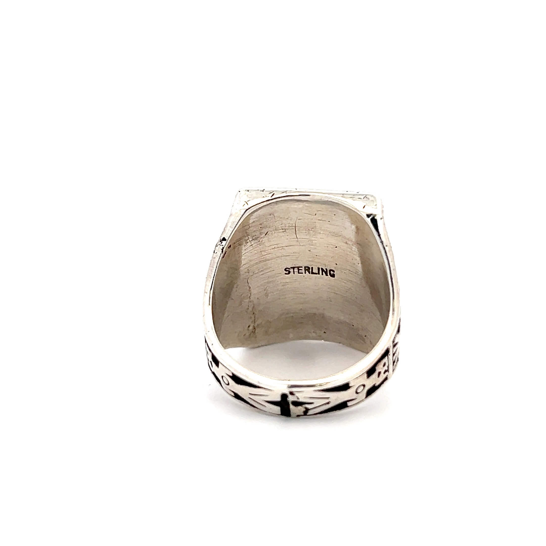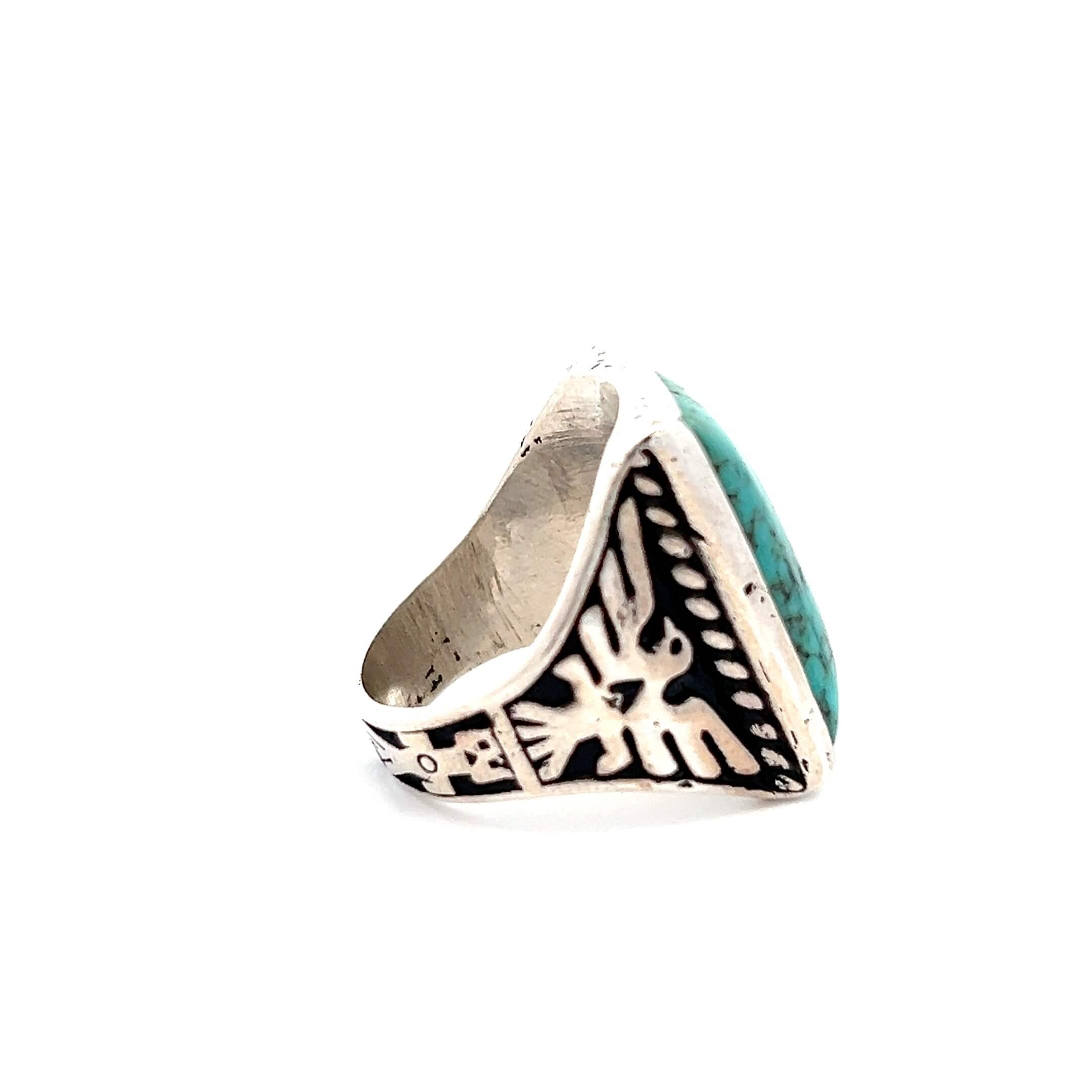 This estate ring is crafted in sterling silver and set with a bold rectangular turquoise stone featuring natural matrix throughout. The wide shoulders are decorated with deeply stamped figural and symbolic motifs, giving the ring strong visual weight and a sculptural presence that reflects early Southwestern design traditions.