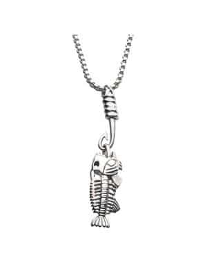 The Fishbone Hook Pendant Necklace in stainless steel features a fishbone and hook fishing pendant measuring 16.50 wide x 71.50 long x 7.30mm deep on a 6mm rounded box chain measuring 24″ long from the Angler Collection by INOX.