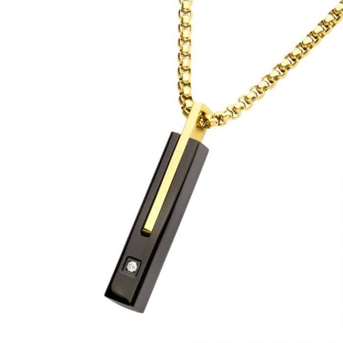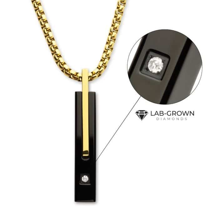 The Gentleman’s Lab-Grown Diamond Two-Tone Necklace is crafted from durable and hypoallergenic stainless steel with an 18 karat yellow gold ion-plated decorative accent bail and chain.