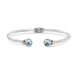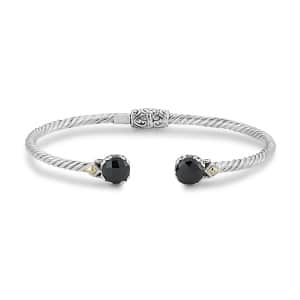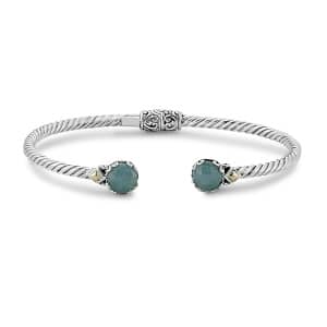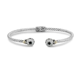 The Birthstone Glow Cuff Bracelet is crafted from sterling silver with solid 18 karat yellow gold accents and features 2 round gemstones measuring 7mm each on a hinged-style twisted cable cuff bracelet measuring 3mm in width. Stamped with 925, 18K, and SB. From the Royal Bali Collection by Samuel B.