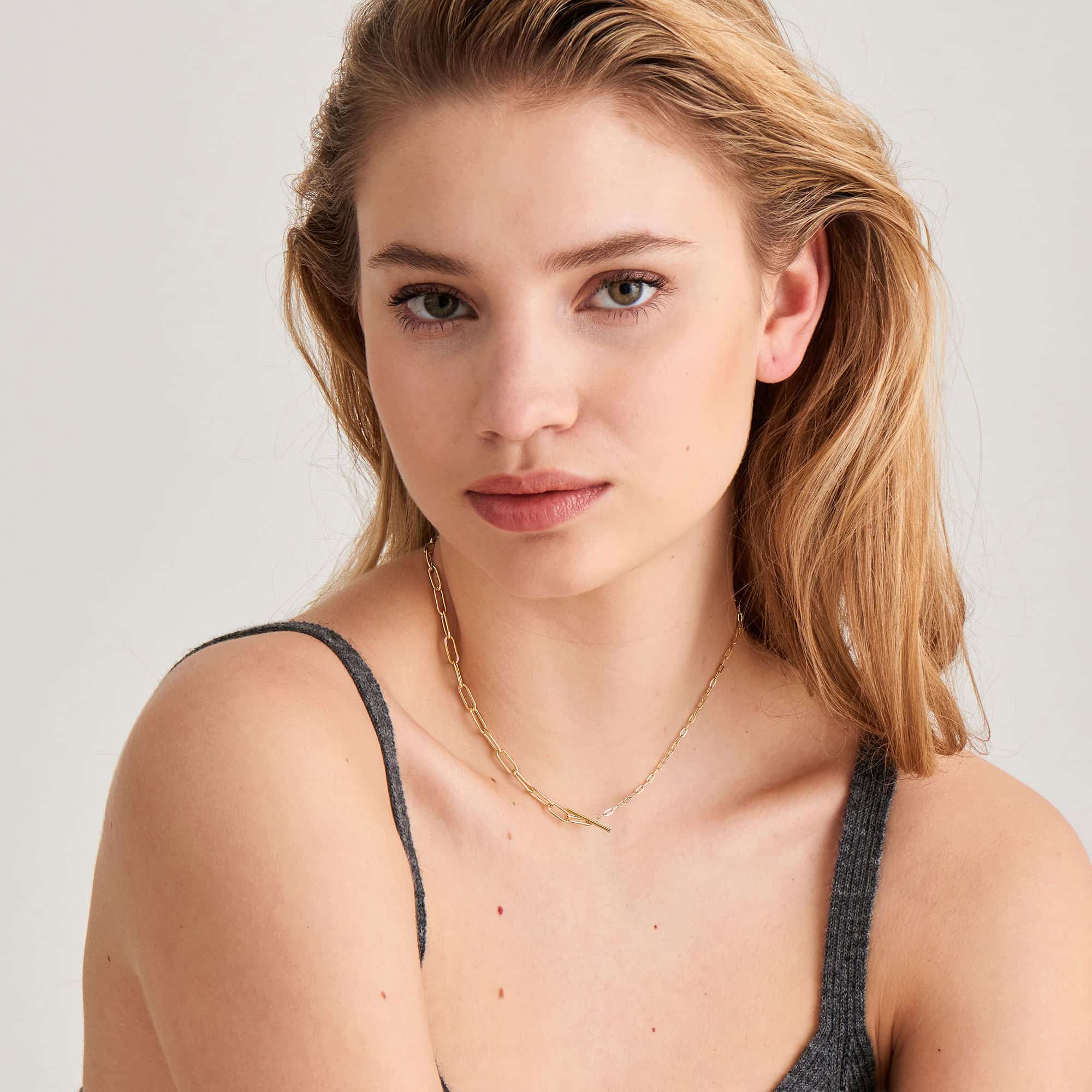 Minimalist elegance at its finest, the Gold Toned Mixed Link T-bar Necklace from Ania Haie’s Chain Reaction collection will fit in perfectly with your jewelry collection. Featuring contrastingly sized links brought together by a decorative t-bar link closure, not a millimeter of metal is wasted with this charming necklace. Wear it alone for a gracefully simplistic statement piece or pair it with your other favorite necklaces for some delicious texture.