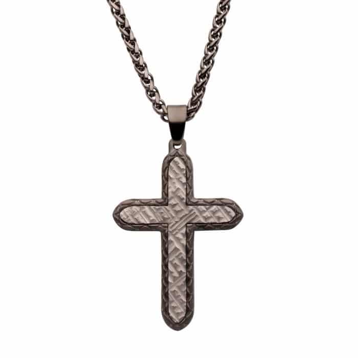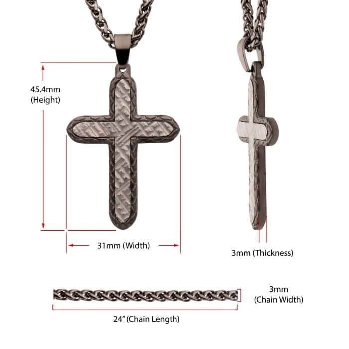 The Gunmetal-Plated Cross Pendant Necklace is crafted from stainless steel with a gunmetal ion-plated frame featuring a Firenze-style texture and a chiseled-texture center.