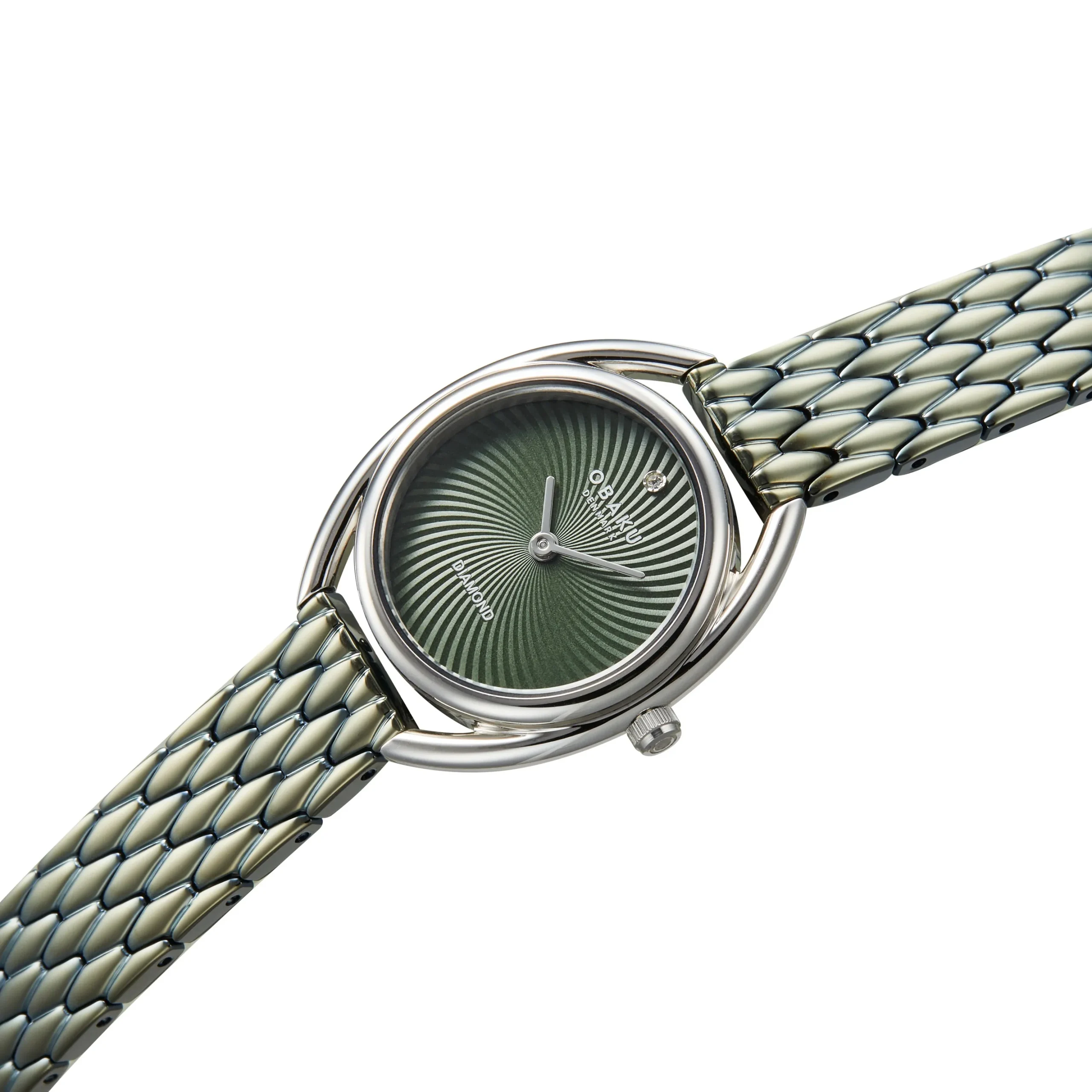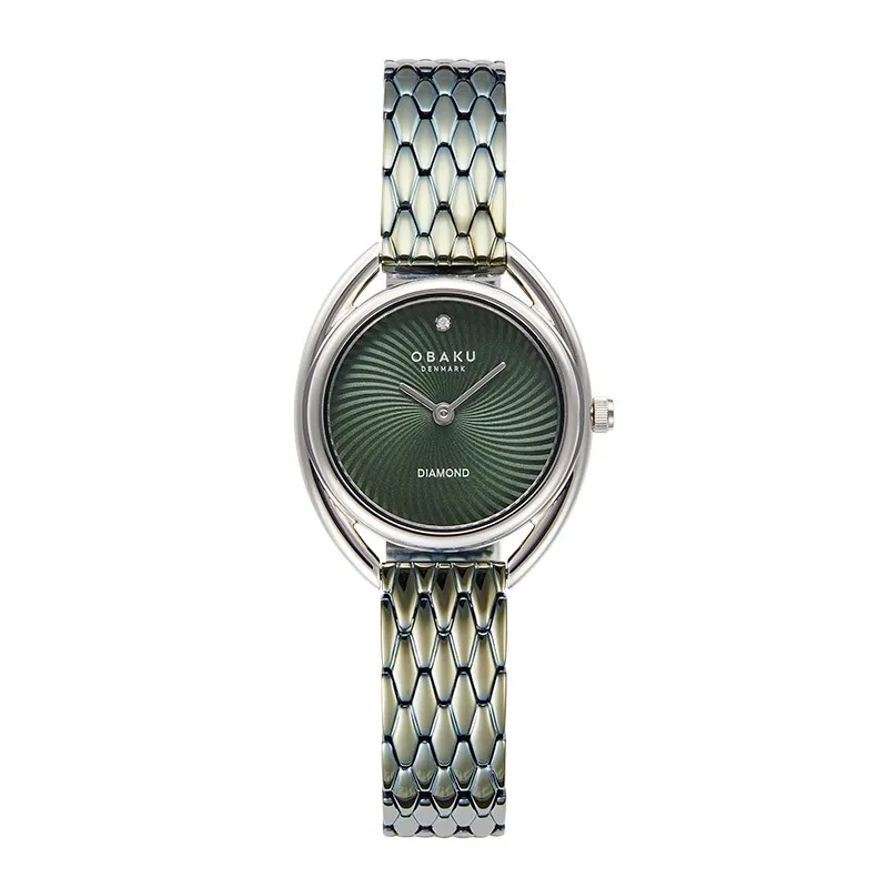 The Juvel Forest by Obaku offers a graceful blend of artistry and precision in a 32mm silhouette. The polished stainless steel case frames a sunburst green dial that ripples outward like leaves in a breeze, anchored by a single diamond at 12 o’clock. Its two-hand quartz movement keeps the layout clean and quietly elegant, while the green stainless steel bracelet adds a dynamic finish with its textured, almost scale-like pattern.