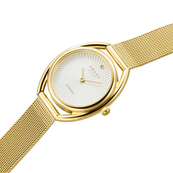 Introducing the epitome of understated elegance: the Juvel Gold by Obaku. Crafted with meticulous attention to detail, this timepiece exudes sophistication and refinement. The gold-tone stainless steel case, measuring 28.6mm, is complemented by a subtle spiral-design silver dial, adding a touch of intrigue to its classic design. At the 12 o’clock position, a single authentic diamond sparkles with timeless allure, capturing the essence of luxury.