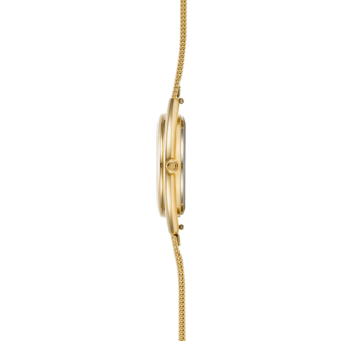 Designed for both style and durability, the extra-hardened mineral crystal ensures clarity and protection, while the gold-tone two-hand movement adds a touch of warmth to every moment. Completing the look is a sleek mesh bracelet, offering both comfort and sophistication.