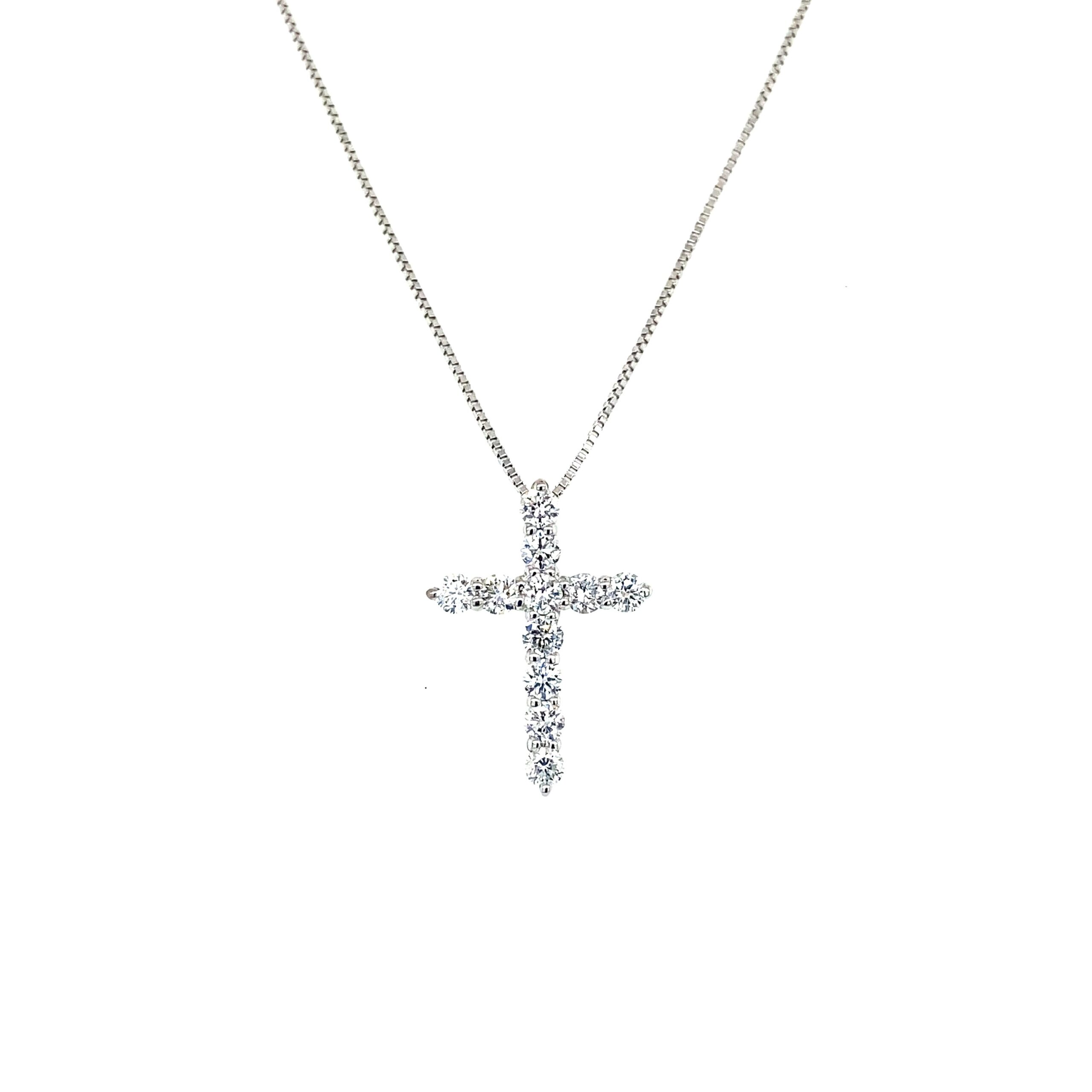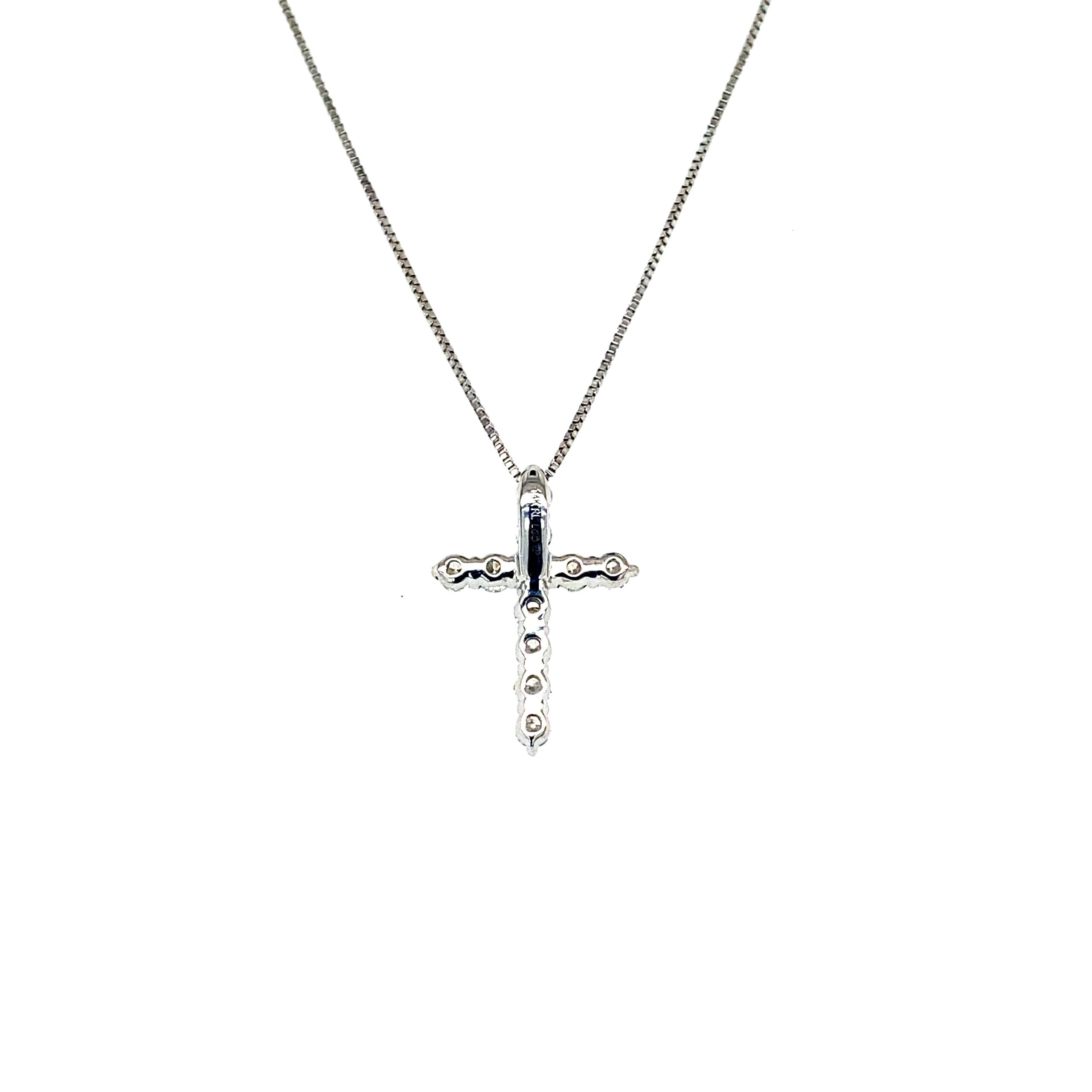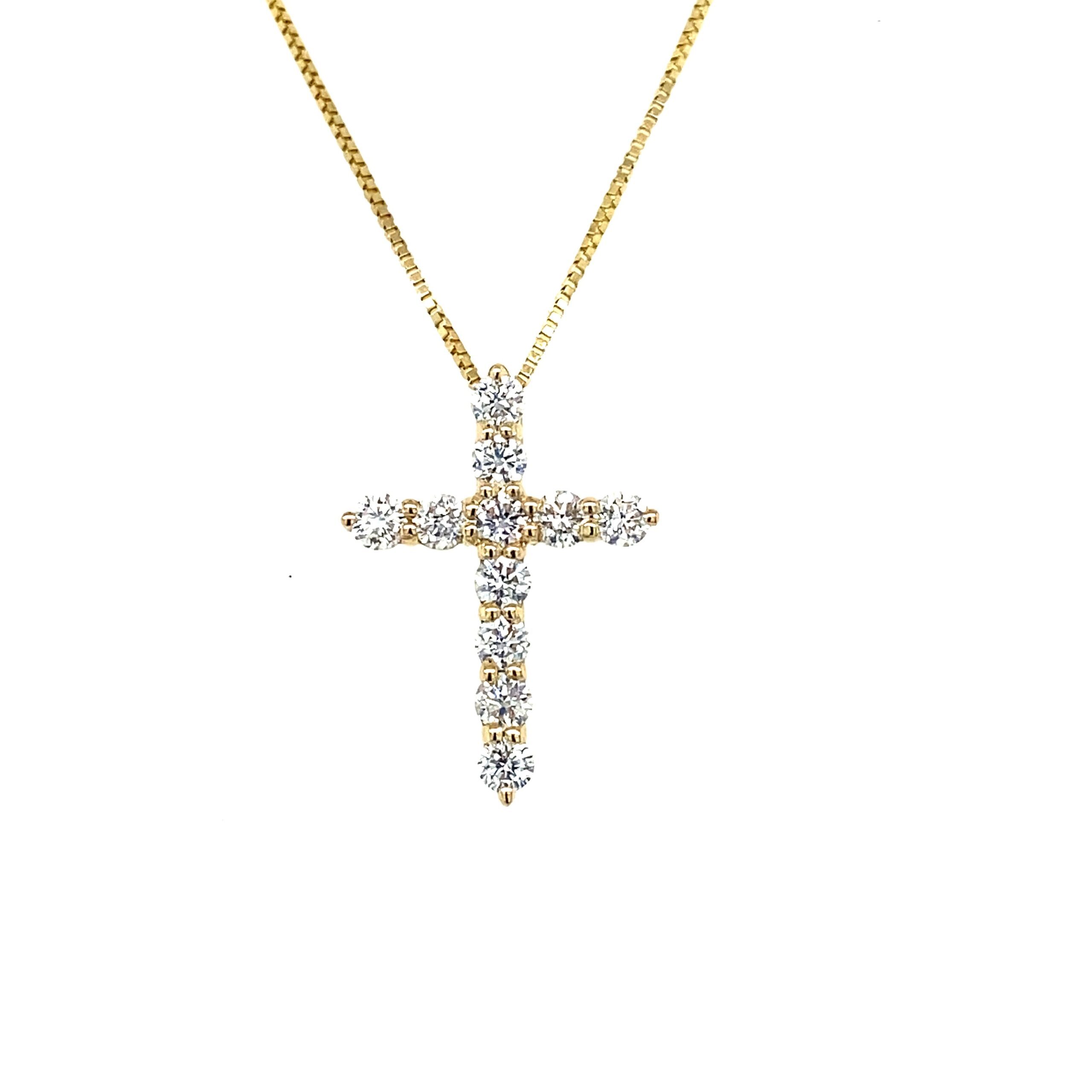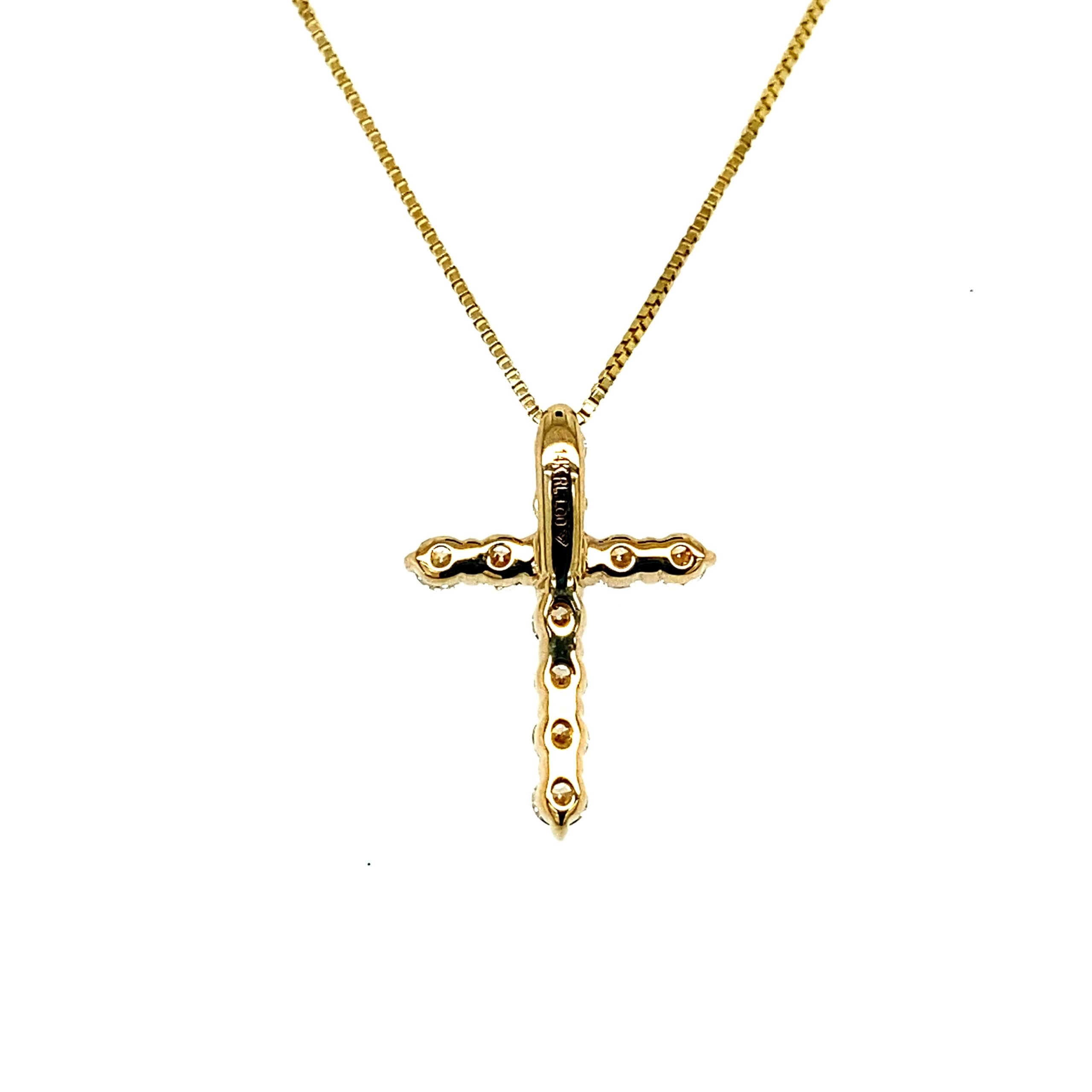 The Lab-Grown Diamond Cross Pendant Necklace in 14 karat gold features 11 lab-grown round brilliant diamonds weighing 0.33ctw with G-H color and VS-SI1 clarity. The pendant has a hidden bail and is suspended from a 14 karat gold petite box chain necklace measuring 18″ in length with a lobster claw clasp.