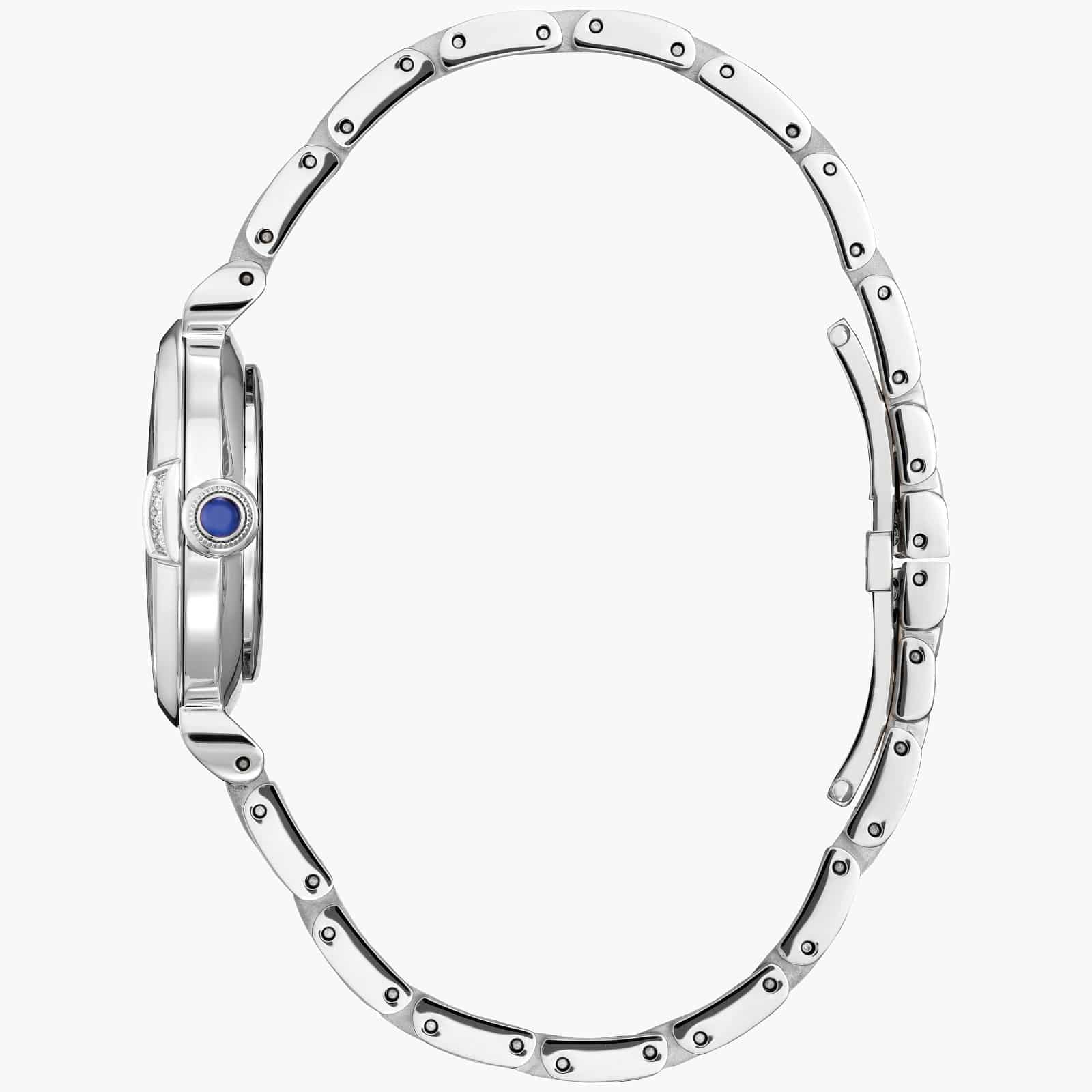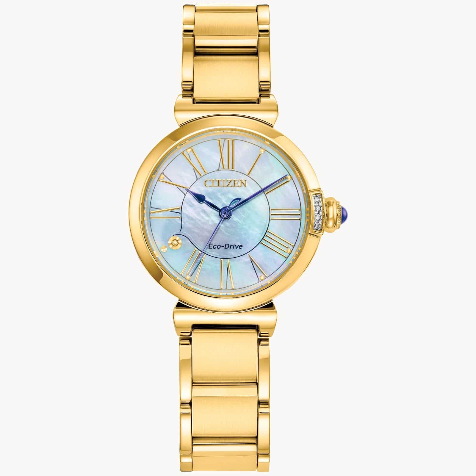The Ladies’ Citizen L Mae Watch is an elegant and romantic-style watch inspired by a vintage perfume bottle, as especially evidenced by the ornate crown at the 3 o’clock marker. The watch is crafted from stainless steel with a superior scratch-resistant sapphire glass, a 29.5mm case, a mother-of-pearl dial made from recycled materials, three-hand movement, and Roman numeral markers with a diamond accent at the 8 o’clock marker.