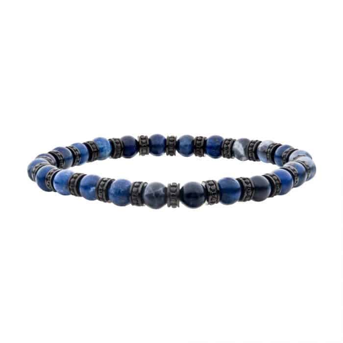 The Lapis Lazuli and Sodalite Beaded Bracelet features 6.50mm round lapis lazuli beads, 6.5mm round blue sodalite beads, and black stainless steel disc accent beads. The bracelet measures 8″ in total length.