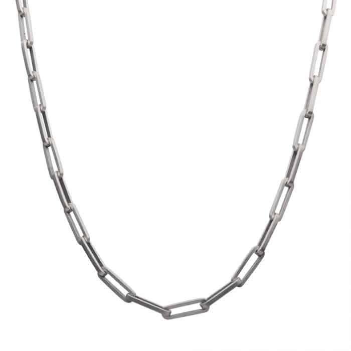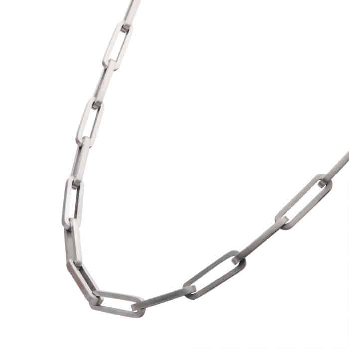 The Matte Finish Stainless Steel Paperclip Chain Necklace is crafted from stainless steel with a matte finish and features square-shaped paperclip-style links measuring 6mm x 20mm. The necklace measures 22″ long.
