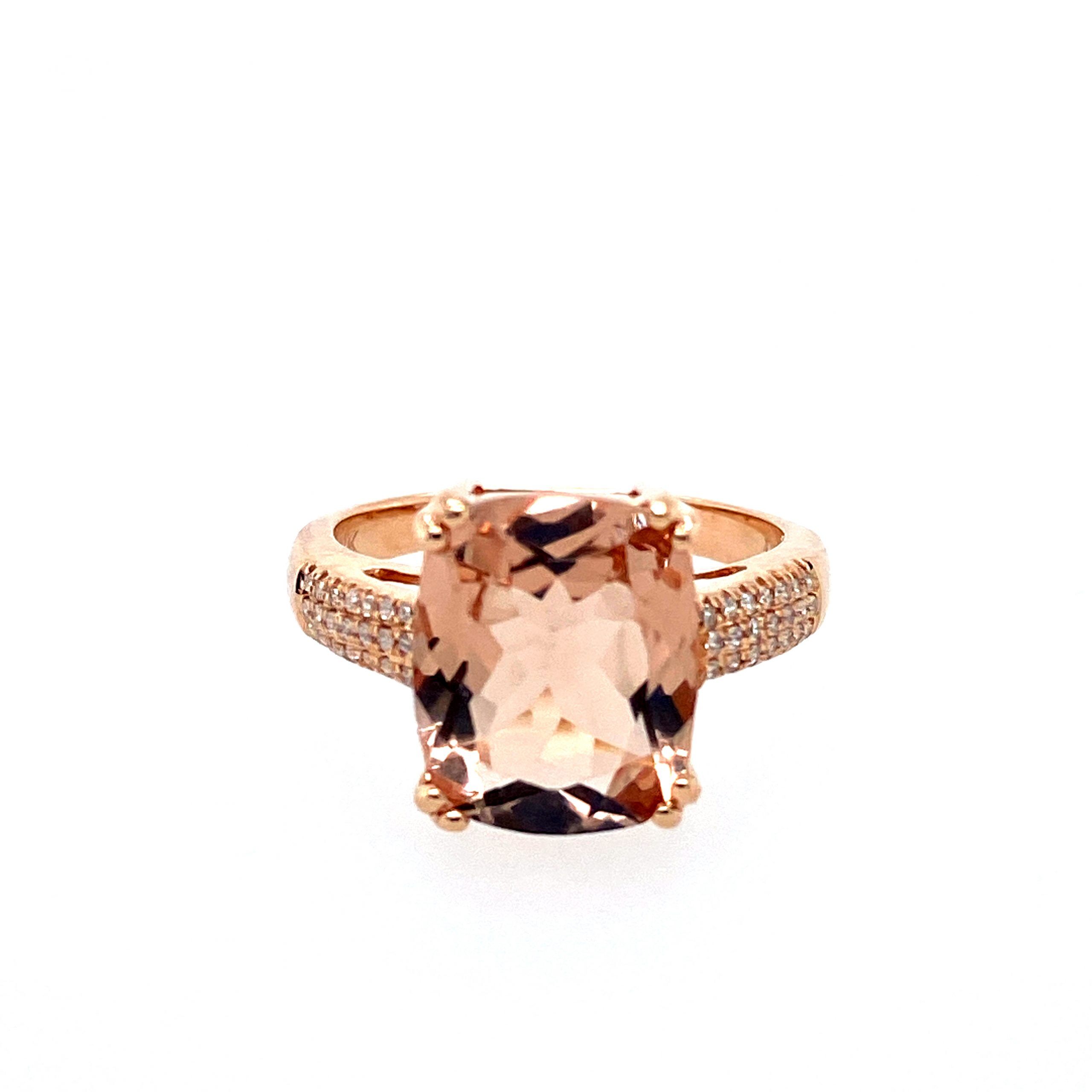 A large cushion shaped morganite is the star of this rose gold ring. The morganite center weighs 4.32 carats and measures 12 x 10 mm. This stunning pink stone is set on a diamond encrusted 14 karat rose gold band.