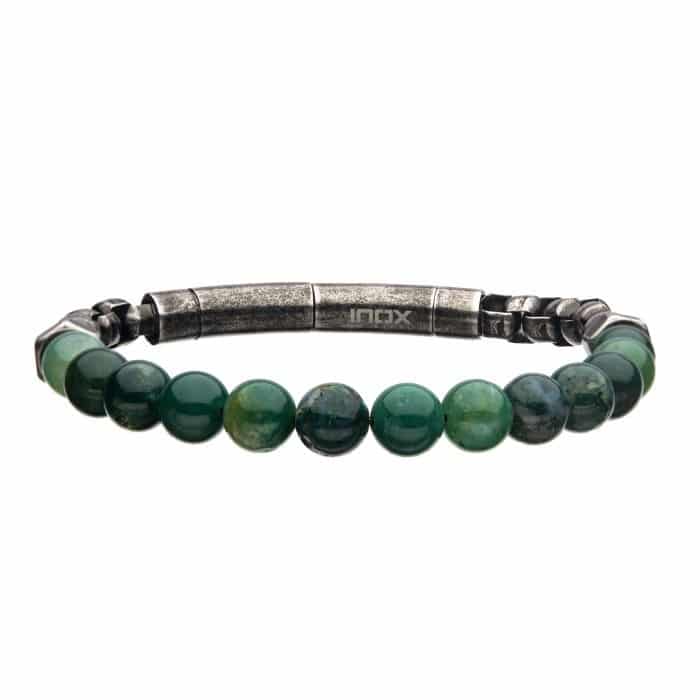 The Moss Agate Antiqued Stainless Steel Bracelet features polished 8mm round moss agate beads with a box chain and a tubular press clasp. The length is adjustable from 8″ to 8.5″.