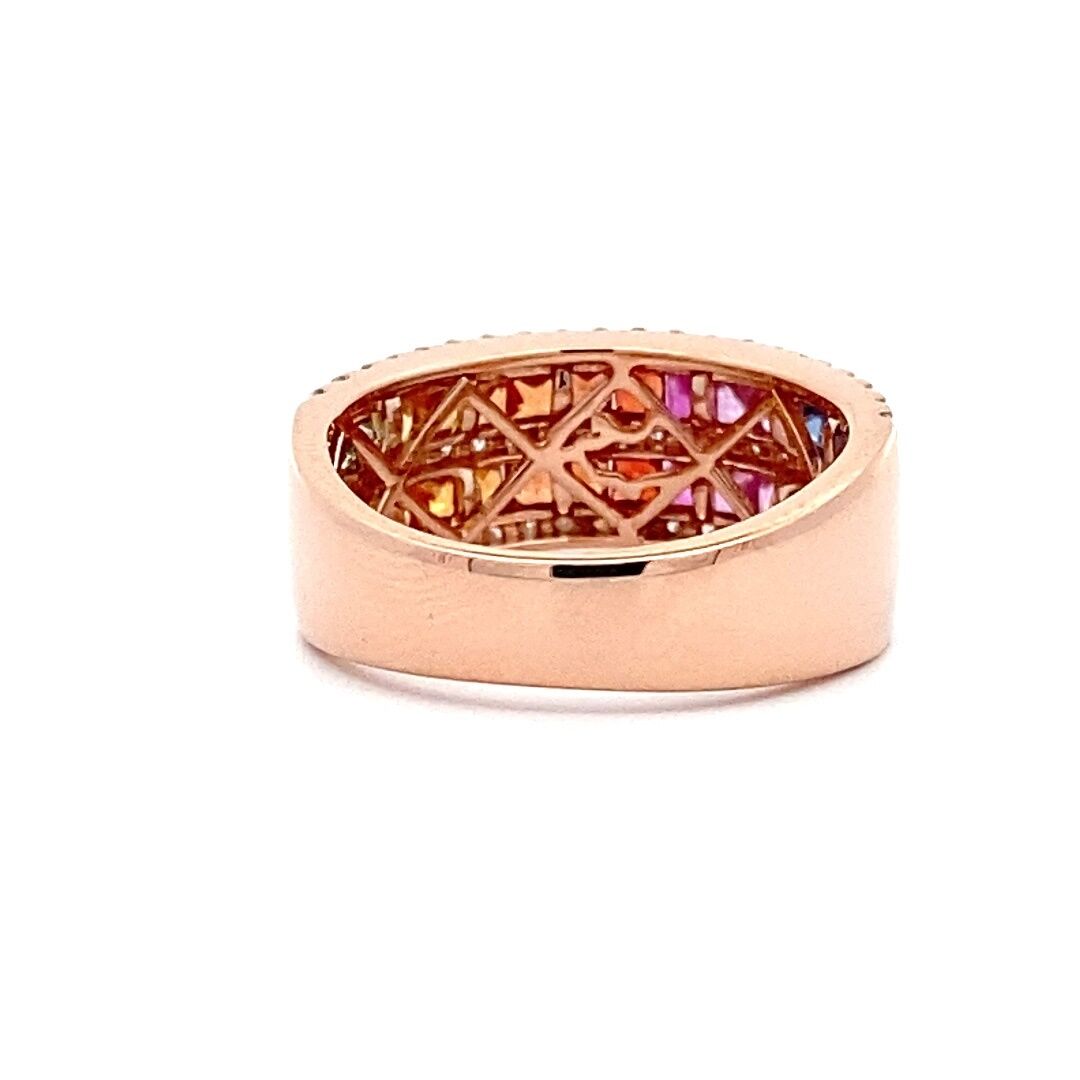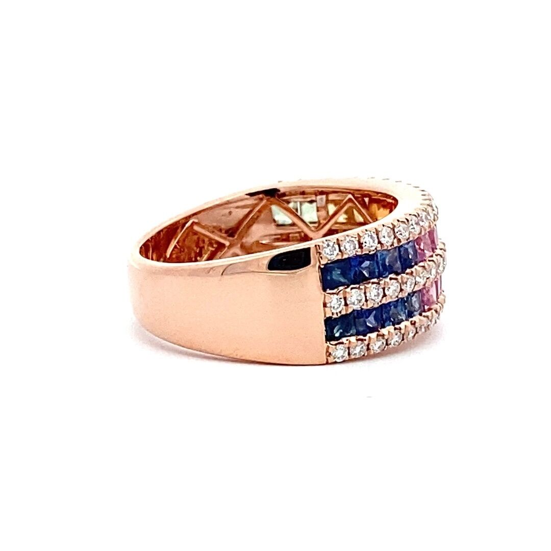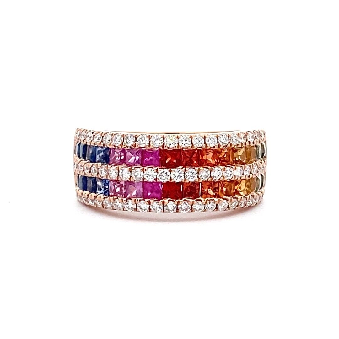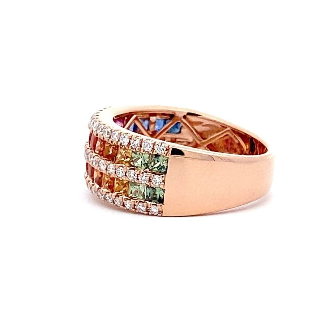 The Multi-Color Sapphire and Diamond Band in 14 karat rose gold features 30 princess-cut sapphires of various hues weighing 1.98ctw in two rows of channel settings, and 64 round brilliant diamonds weighing 0.55ctw with H-I color and SI2-I1 clarity in three rows of prong settings. Finger size 7.