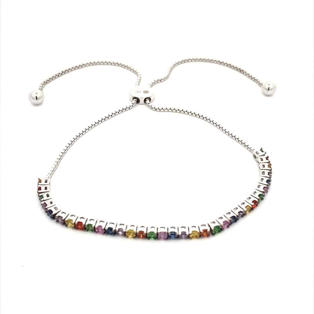 The Multi-Color Sapphire Bolo Line Bracelet in 14 karat white gold features 33 round-faceted natural multi-color sapphires weighing 1.25ctw in black rhodium-plated four-prong settings. The bracelet measures 9″ in total length with an adjustable bolo-style clasp.