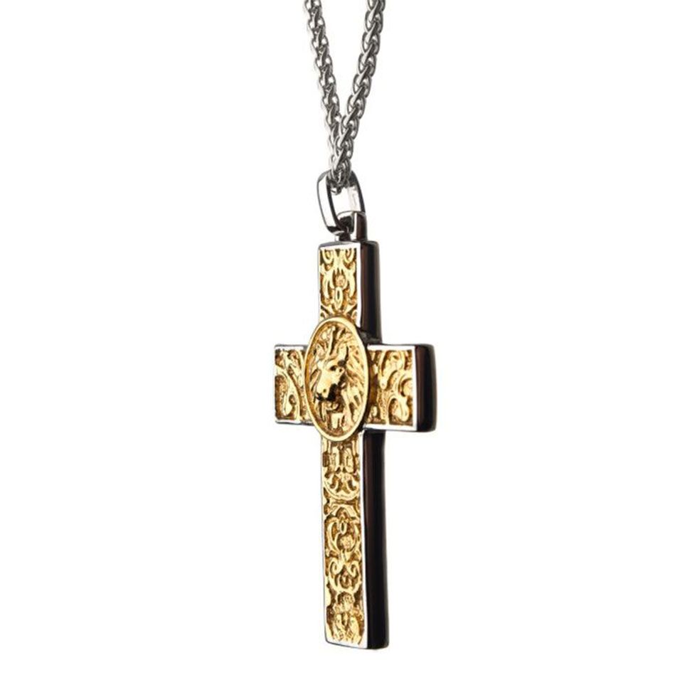 This steel necklace features a yellow gold vermeil cross with a Nymeria lion engraved with scrollwork surrounding it.