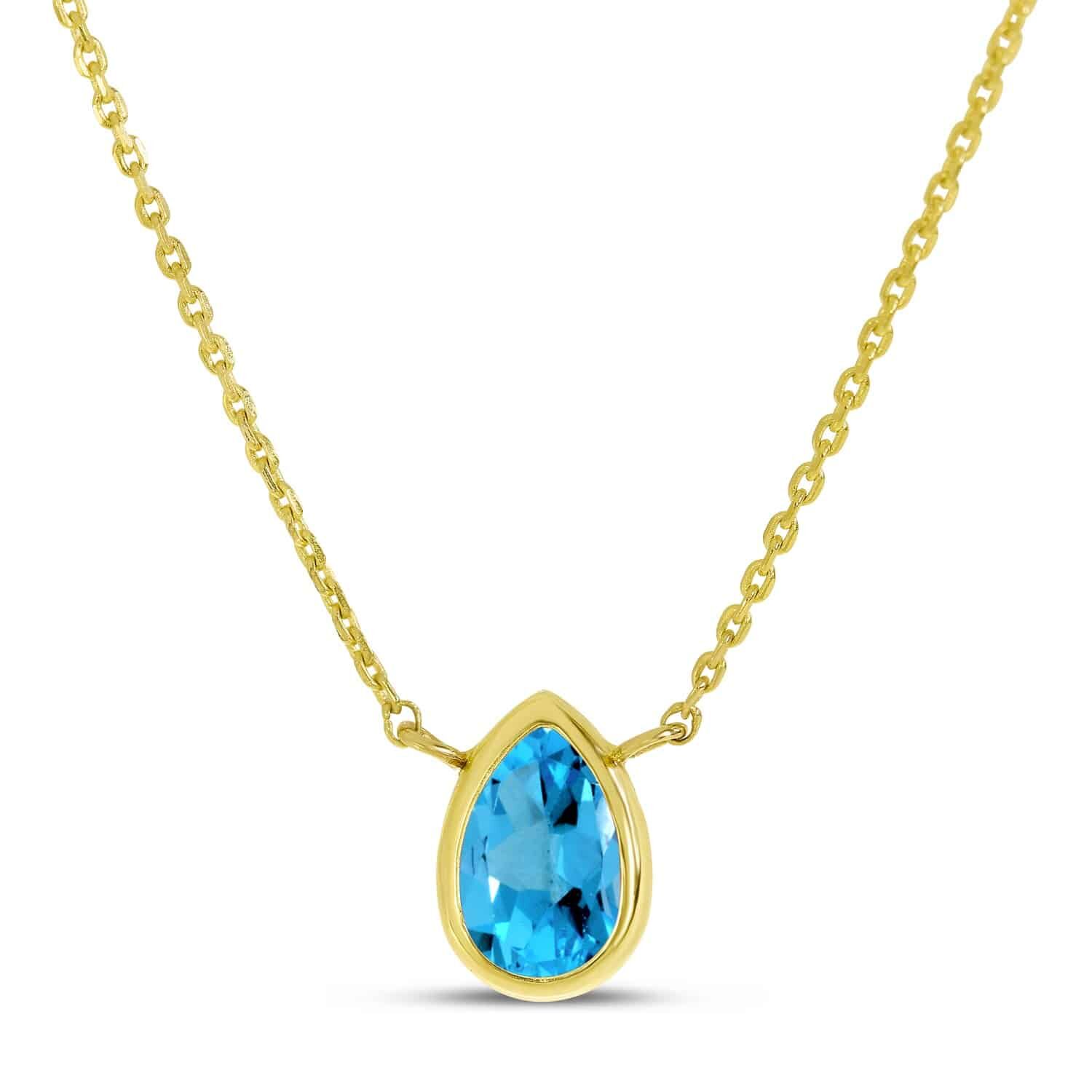 The Pear-Shaped Birthstone Necklace in 14 karat yellow gold features one pear-shaped gemstone measuring 6mm x 4mm in a bezel setting on a 14 karat yellow gold cable chain measuring 18″ in length.
