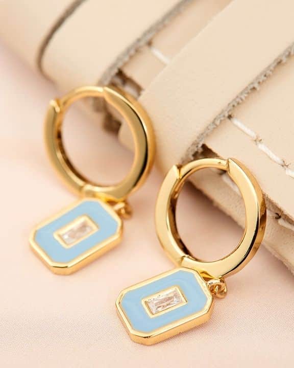 Sink into the soothing and refreshing color of the Powder Blue Enamel Emblem Hoop Earrings from Ania Haie’s Bright Future collection. Each huggie hoop earring features a powder blue enamel charm accented by a central cubic zirconia stone. A drop huggie hoop with energizing charm. Wear alone for a playfully elegant statement piece or stack it for some colorful texture.