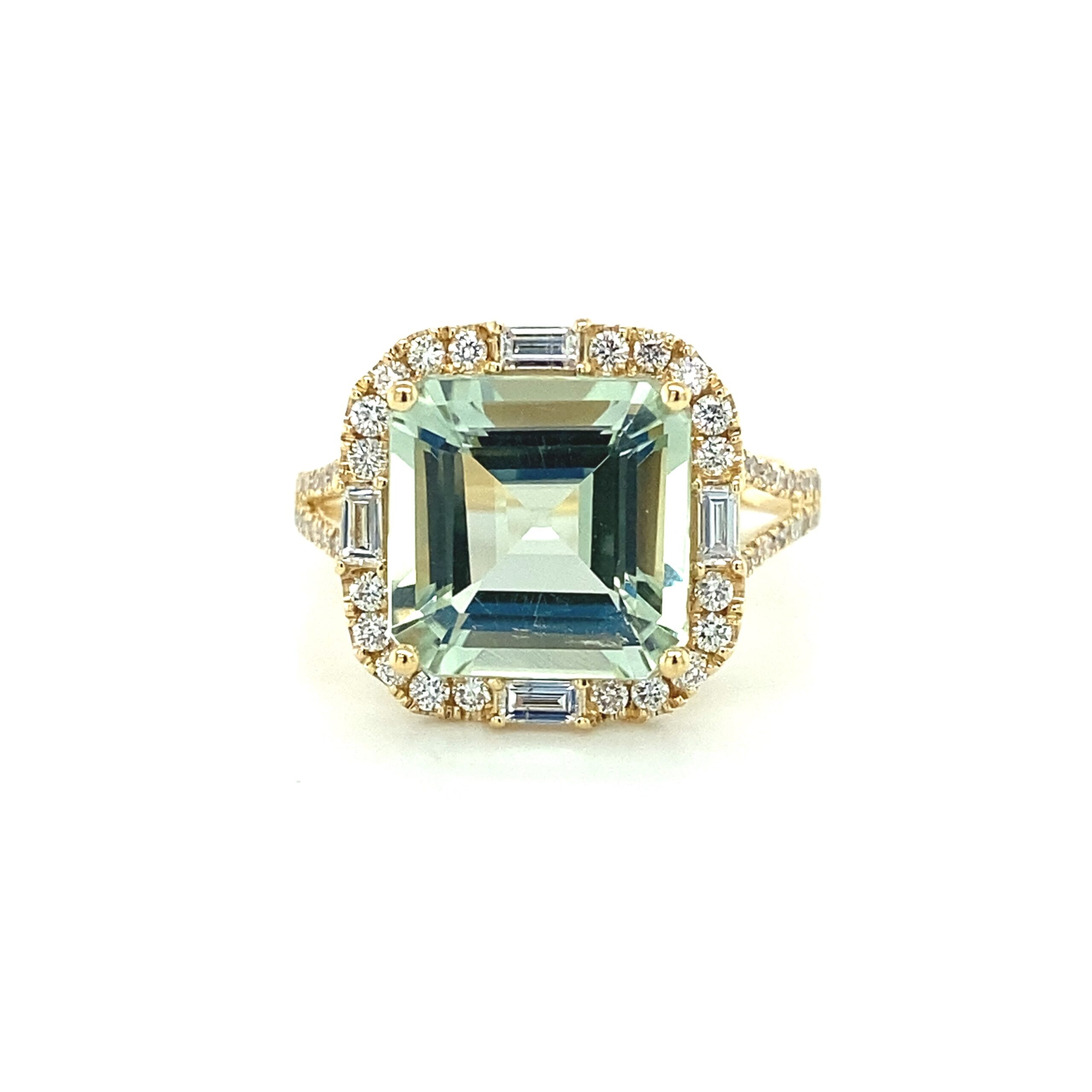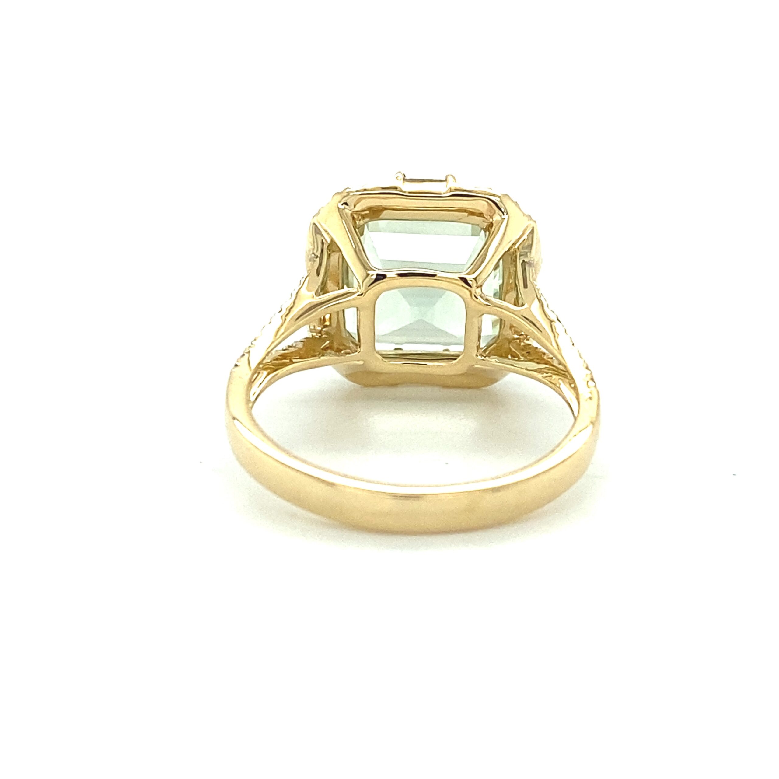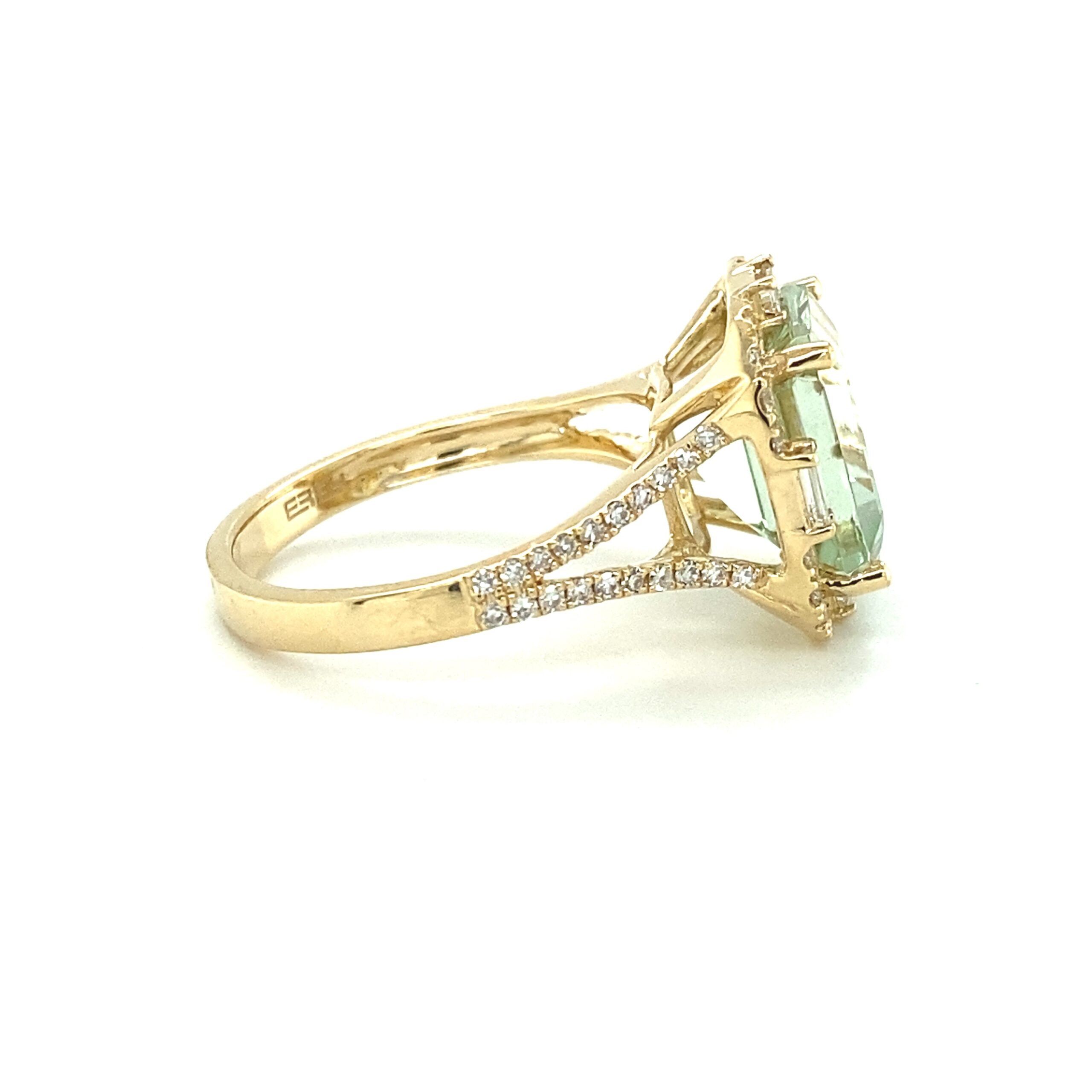 The Prasiolite and Diamond Ring in 14 karat yellow gold features a square-cut prasiolite weighing 3.90ctw accented with 64 diamonds weighing 0.50ctw with matching H-I color and SI2-I1 clarity, including 4 baguette-cut diamonds and 60 round brilliant diamonds, set in the square-shaped halo and the split-shank band. The inside of the shank is stamped “14K” and with the Effy logo. Finger size 7.