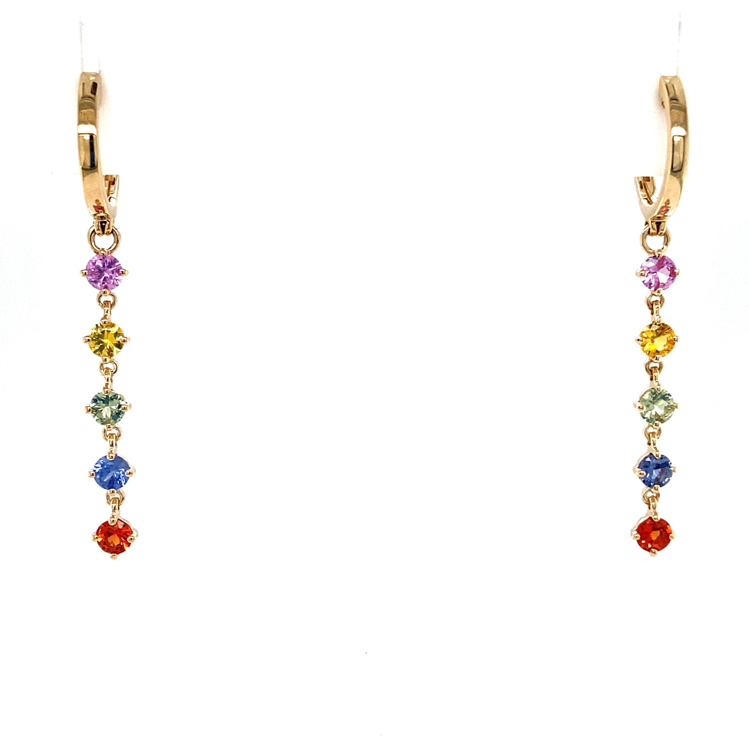 The Princess Sapphire Dangle Huggie Hoops in 14 karat yellow gold are from the Princessa Collection by Bellarri. The pair of combination line dangle and huggie hoop earrings feature 10 faceted round-cut sapphires of varying hues measuring 3mm each and weighing 1.47ctw. Secured with a hinged closure. Stamped “14K” and with the Bellarri logo.