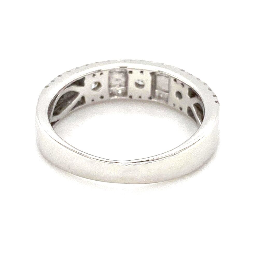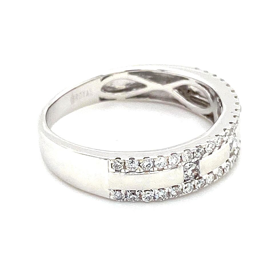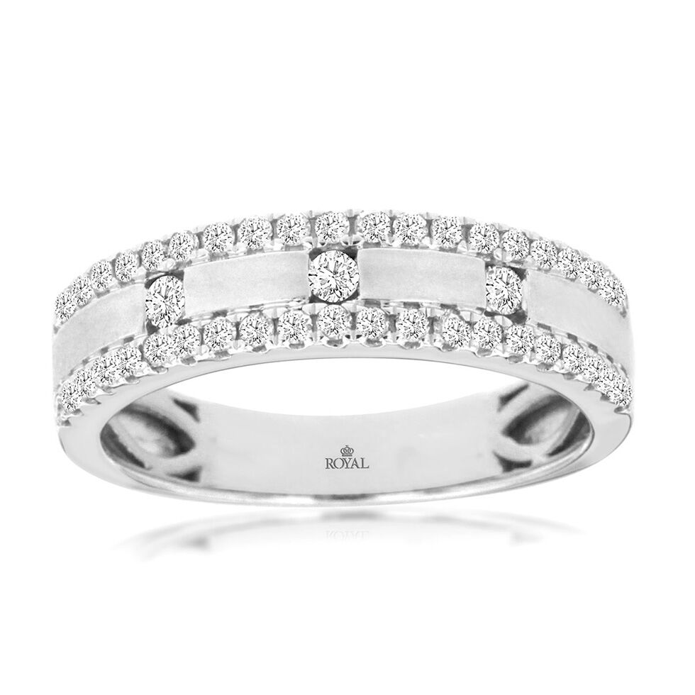This 14 karat white gold band features a satin finish with round brilliant diamonds weighing 0.42 carats in total with H color and I1 clarity.