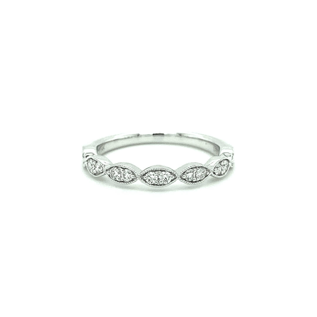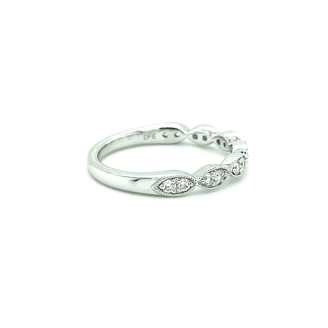 This fourteen karat white gold band features scalloped edging with marquise shapes and milgrain detail. Two round diamonds sparkle in each marquise design. The diamonds have a total weight of 0.25 carats with near colorless diamonds and excellent clarity.