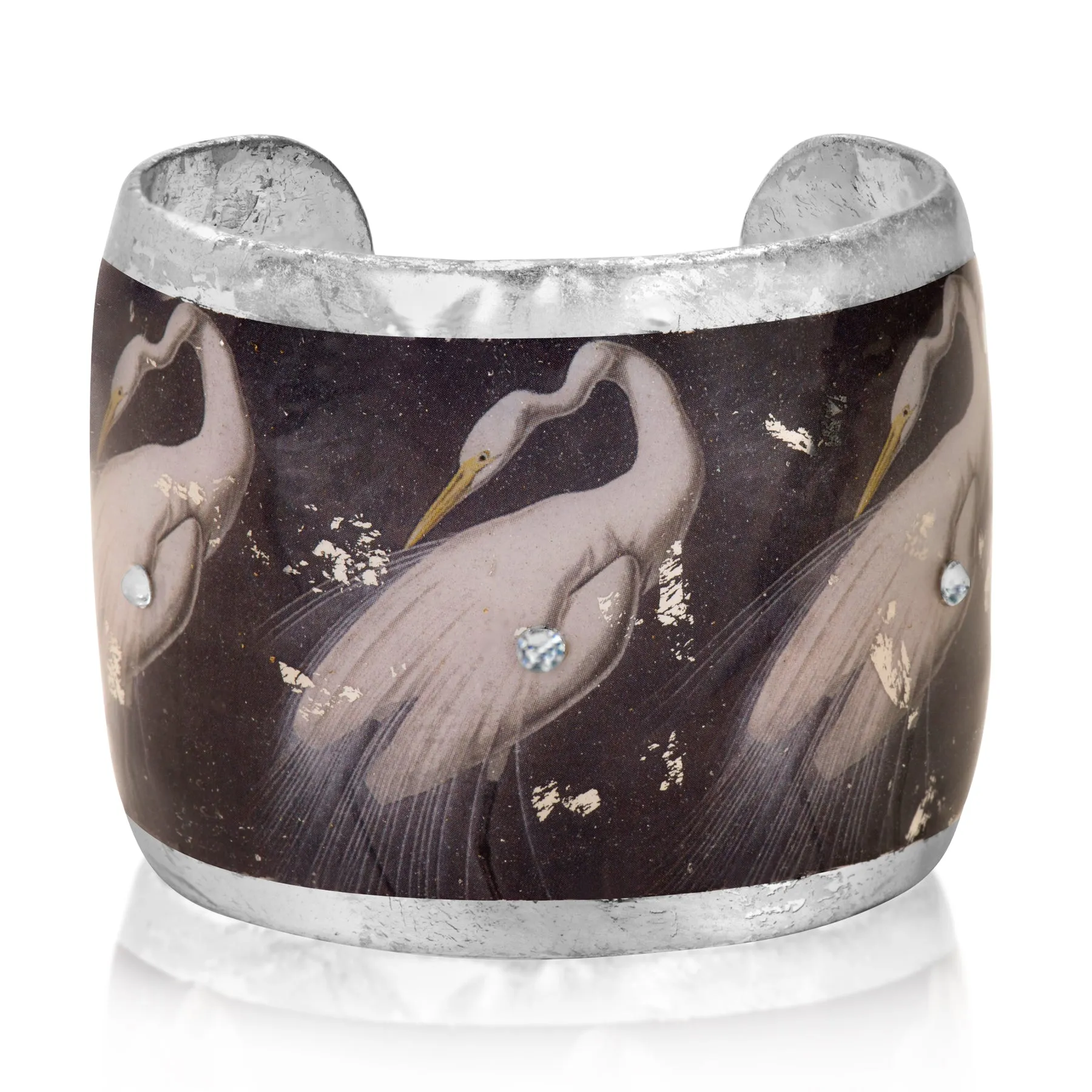 Inspired by the majestic beauty of the Great Egret, this cuff bracelet showcases three images of the elegant snowy egret in a serene preening pose. The hand-applied sterling silver leaf enhances the rich patina of the piece, while Swarovski crystals add a gentle sparkle that brings the bird imagery to life. Every element of this cuff is carefully handcrafted, making it a unique work of wearable art.