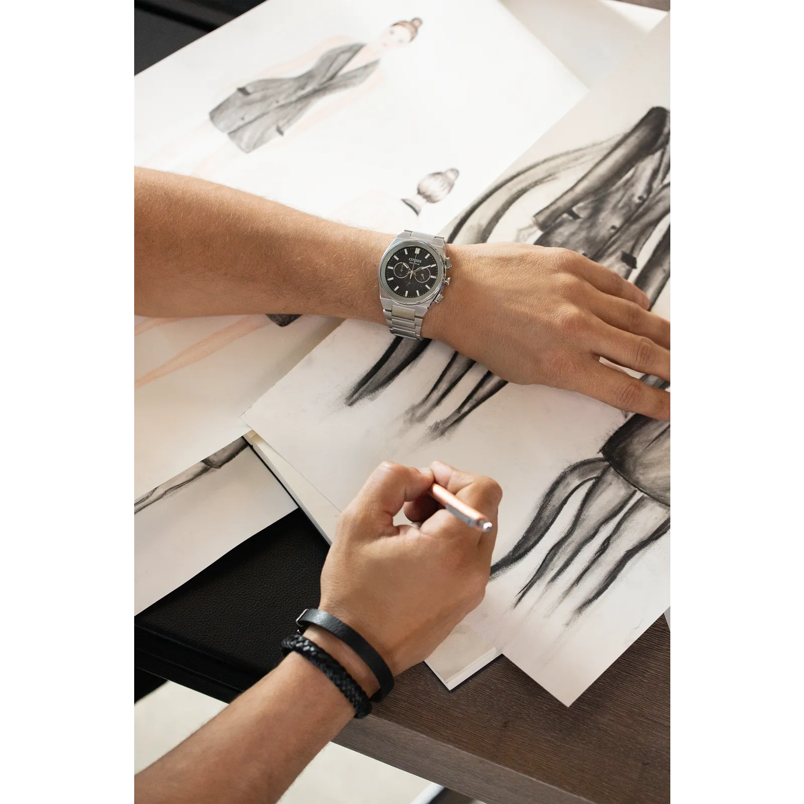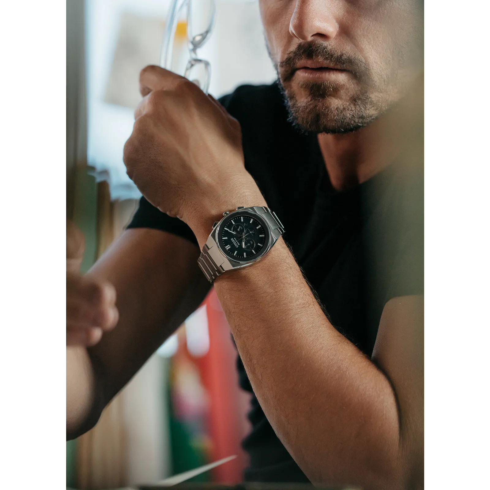 The Silver Tone Axiom Watch by Citizen seamlessly blends sports watch aesthetics with refined styling, making it the ultimate accessory for both workdays and weekends. This sophisticated timepiece features a sleek silver-tone stainless steel case and an integrated bracelet, complemented by a streamlined black dial. The dial is adorned with two sub-dials at 3 and 9 o’clock, outlined in silver-tone to match the indices and hands, providing a harmonious and stylish look.