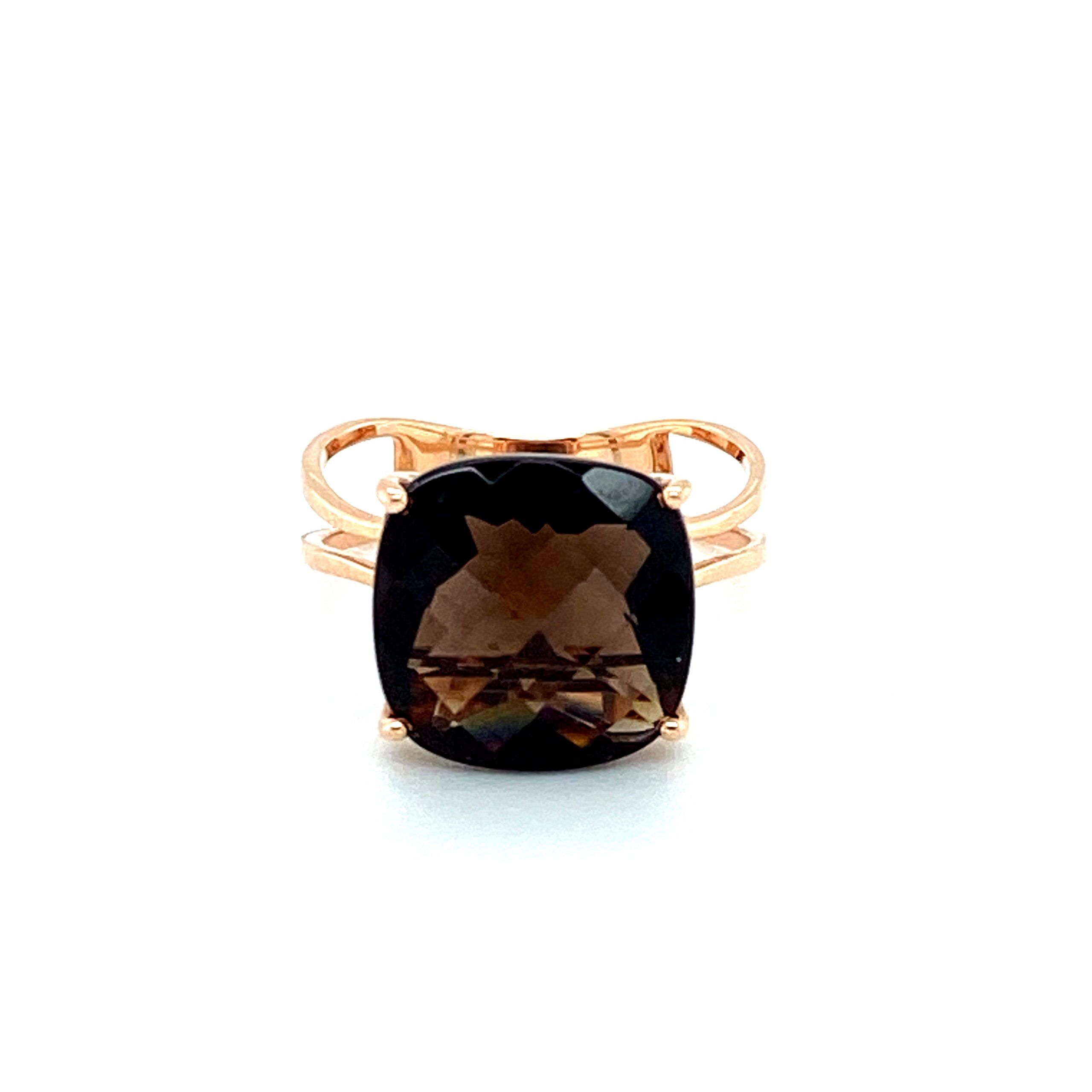 A large cushion shaped smoky quartz sits at the center of this modern, split-shank ring made of 14 karat rose gold. Size 7.