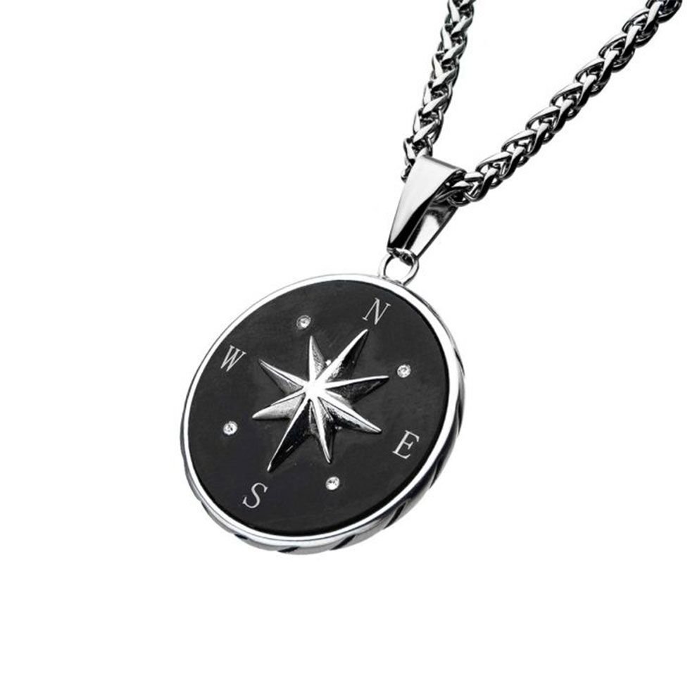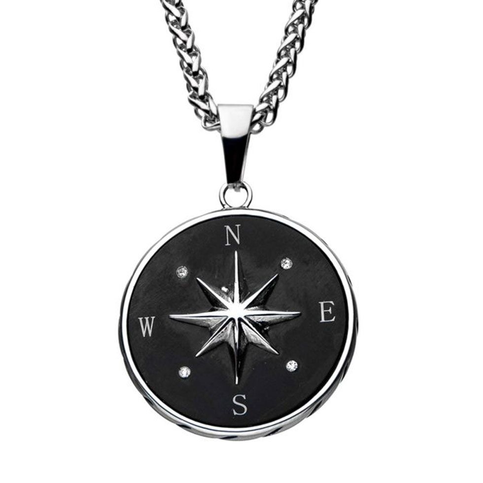 This stainless steel necklace features a black plated compass with cubic zirconia on a 24″ wheat chain.