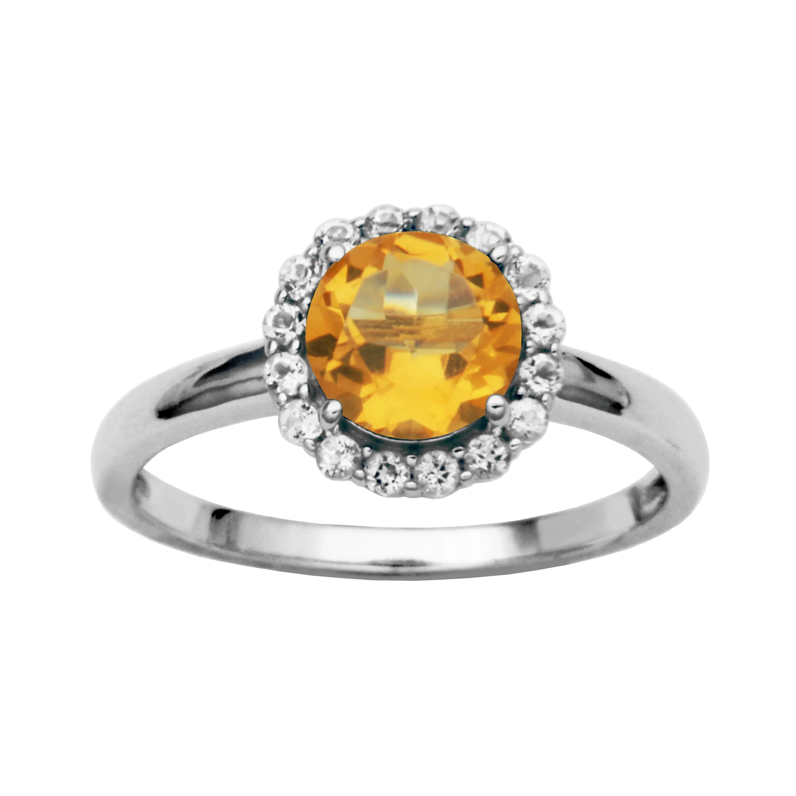 Radiating warmth and joy, this sterling silver halo ring features a vibrant 7mm round citrine surrounded by a halo of 16 dazzling white topaz stones. The sunny yellow hue of the citrine is beautifully accentuated by the shimmering brilliance of the halo, creating a design that is both cheerful and elegant.