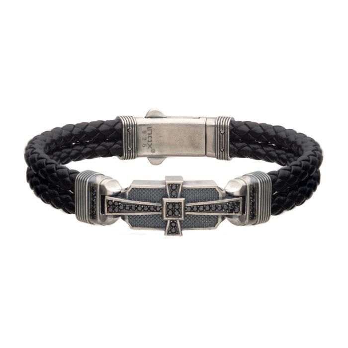 Sterling Silver Double Braid Black Leather Bracelet