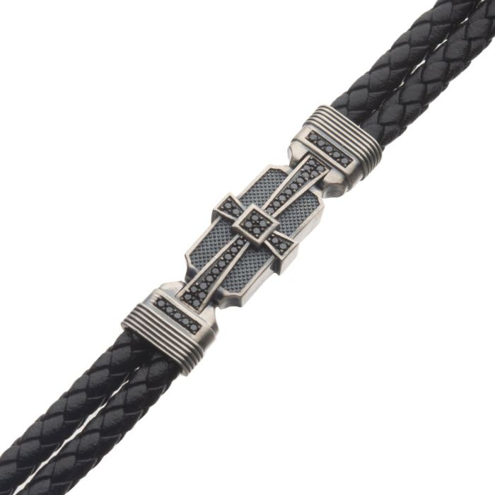 Sterling silver double braid black leather black CZ Deco style bracelet, 8.25″.