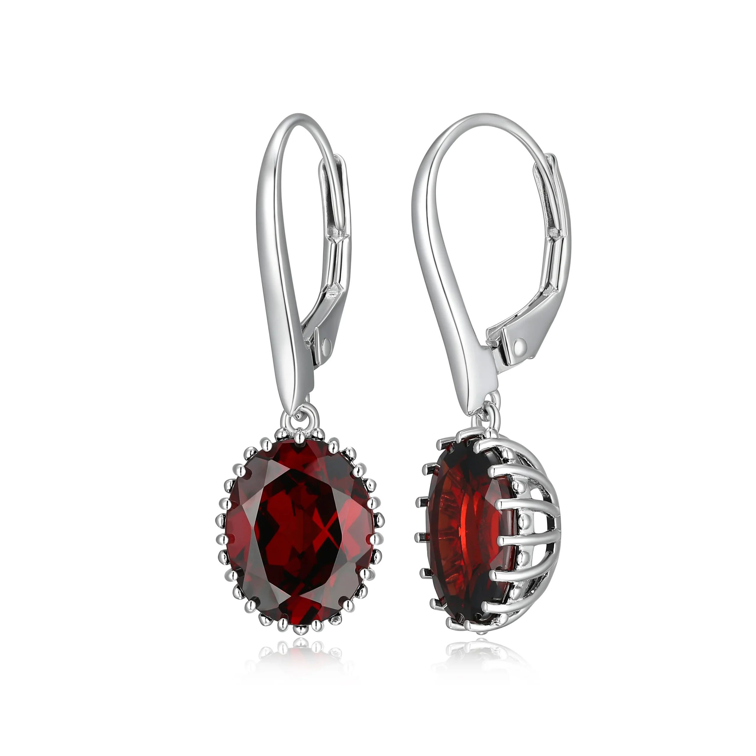 These sterling silver drop earrings feature richly colored oval garnets suspended from classic leverback closures. The garnets are set in a decorative beaded prong basket, allowing maximum light to enhance the gem’s deep red hue. The sculptural cage design on the back adds both security and visual intrigue.