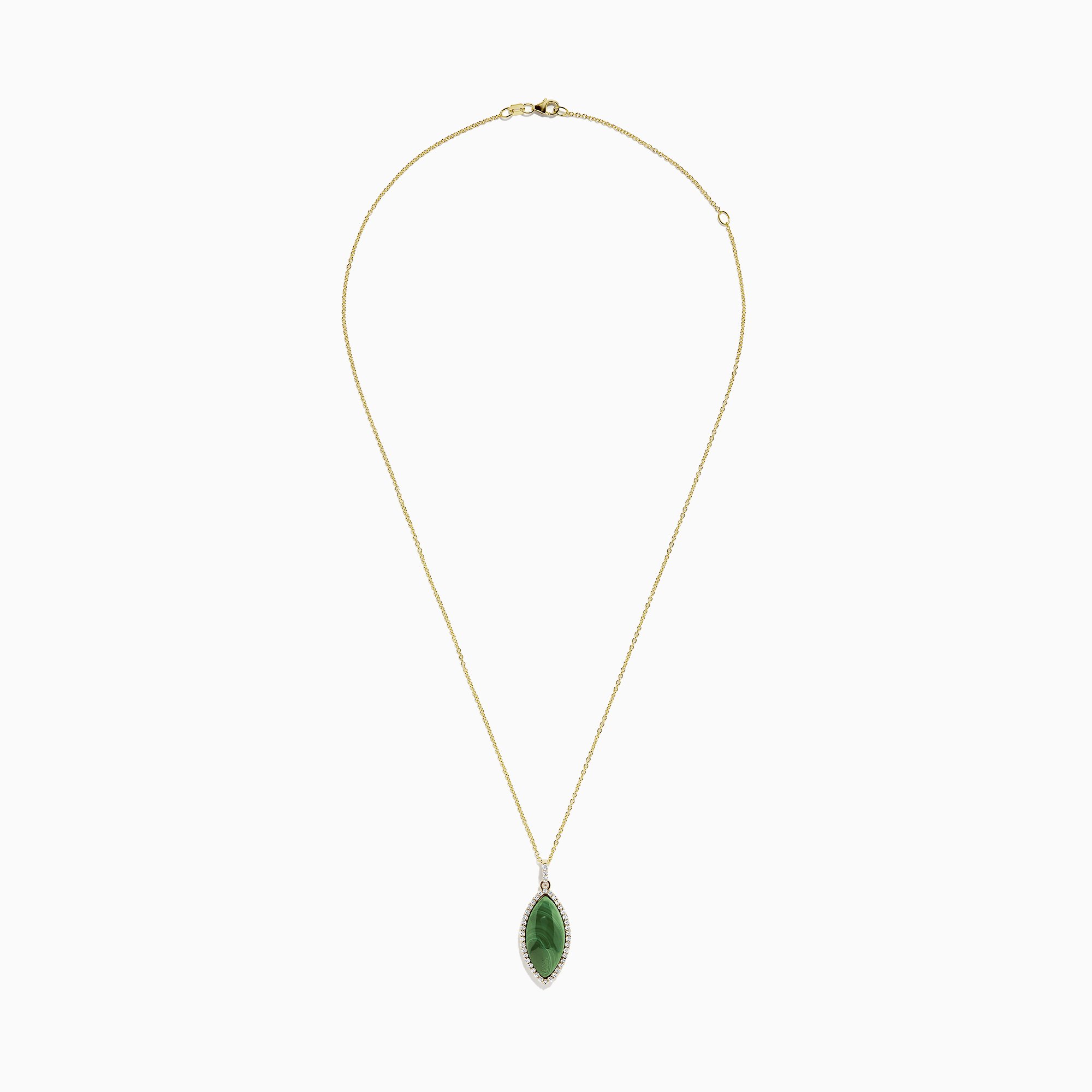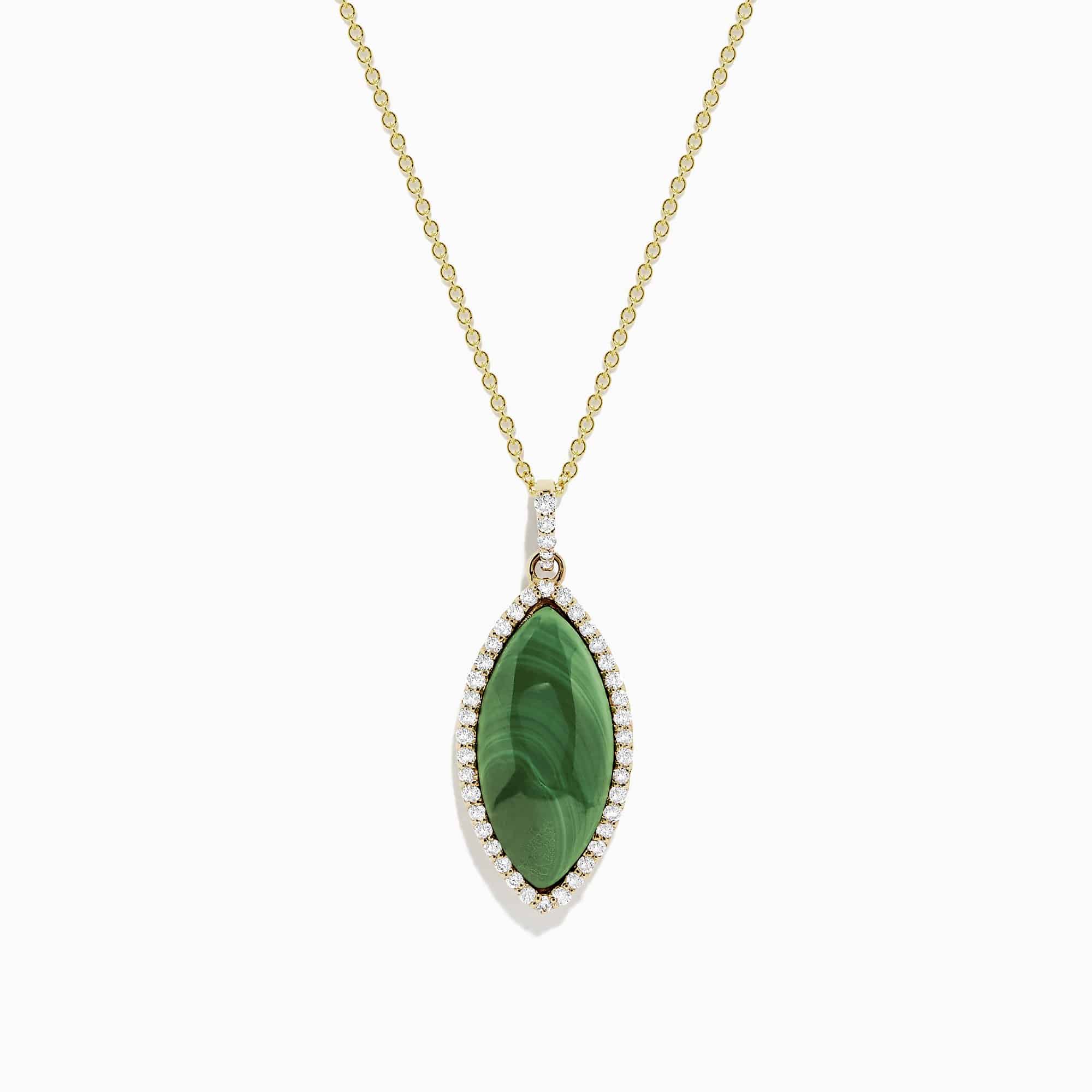 43 dancing round diamonds surround a verdant marquise cabochon malachite center stone. This pendant is suspended on an 18″ chain that can be worn at 16″, 17″, and 18″ and is secured with a lobster claw clasp.